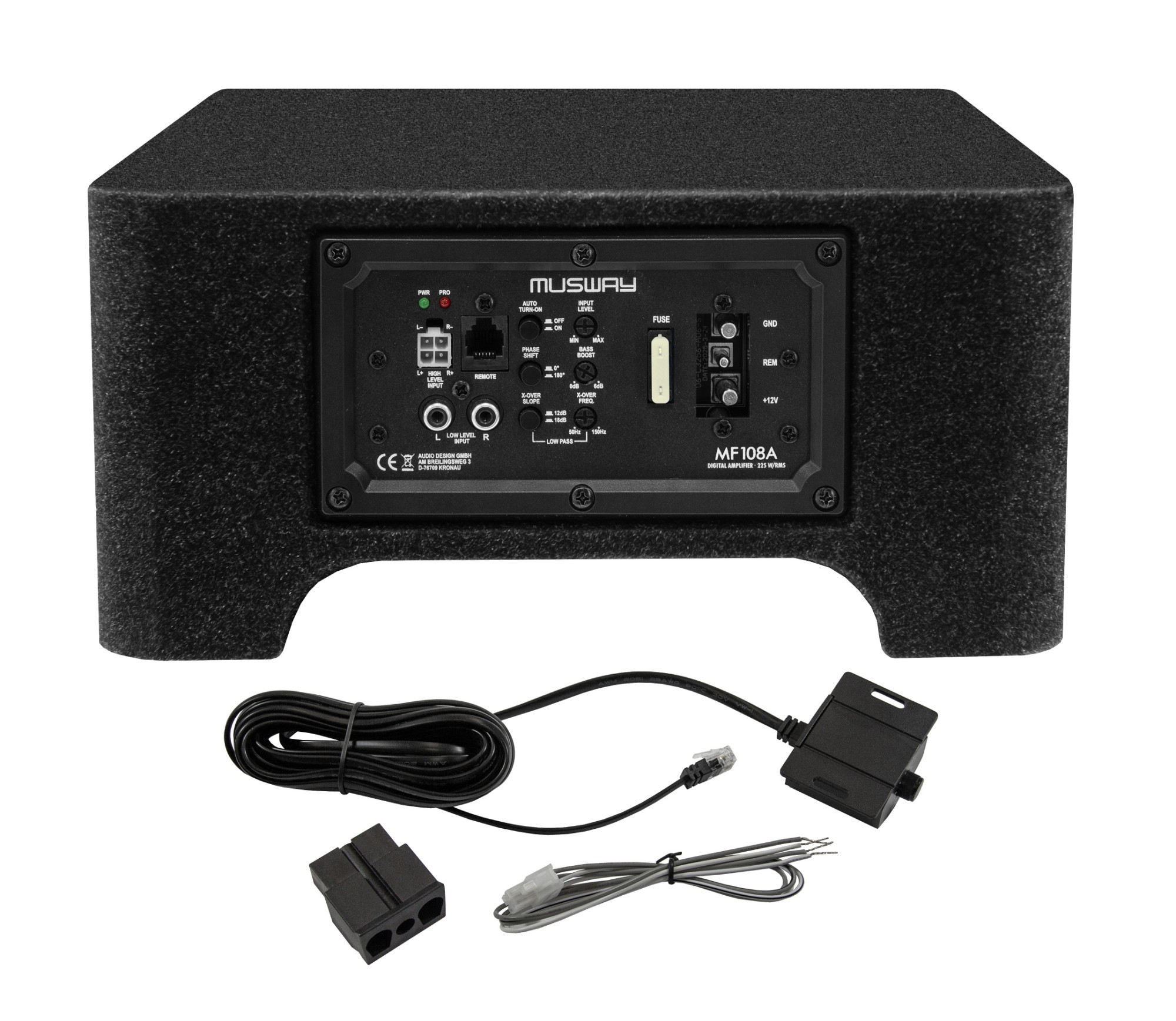active subwoofer in a closed enclosure, Ø 8", 225 W RMS, class D amplifier, remote control