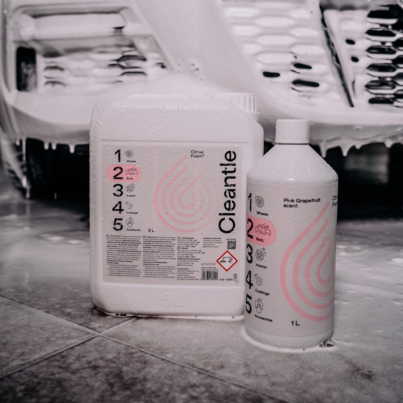 Cleantle Citrus Foam2 is a highly concentrated, slightly alkaline active foam intended for pre-washing. Effectively dissolves dirt and degreases the surface. The product does not contain sodium hydroxide, potassium and other substances that can cause corrosion or matting of the surface. Thanks to this, this active foam is completely safe for the paintwork and other parts of the body. The product can also be used as a pre-wash and is not harmful to the skin of the hands. Does not damage ceramic coatings, waxes or sealants. The scent of pink grapefruit will delight you while you work.