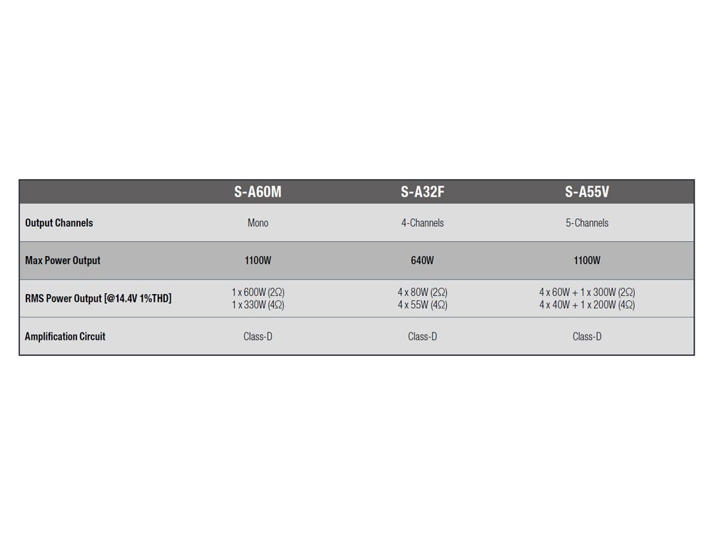 Alpine introduces the brand new S-series amplifiers - a perfect match for the S-series loudspeakers. These amplifiers have excellent performance in the Class D category and very high thermal resistance. They also have excellent sound quality for their price range. The S series amplifiers are available in mono, 4 and 5 channel configurations.