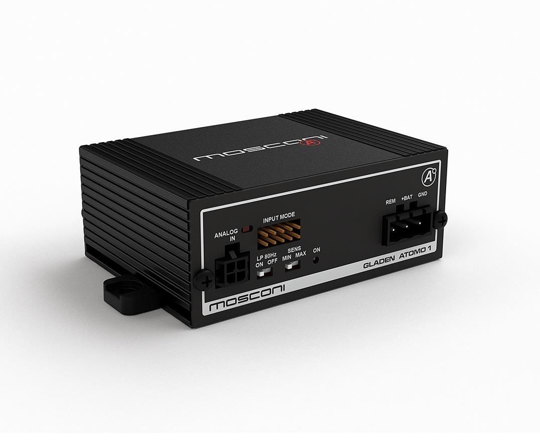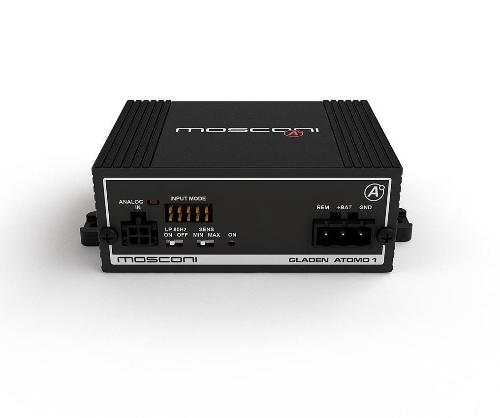Extremely compact 1-channel amplifier. In the world of car radios where “size matters” more than ever in 2021, the Mosconi Gladen ATOMO 1 has something to say. Rated at 250W RMS into 4 ohms, the Class D amplifier uses a robust aluminum chassis with remarkably small dimensions, meaning it can be hidden virtually anywhere. Together with Mosconi Gladen's ATOMO 2 amplifier and its ATOMO 4|6 DSP for signal control, it enables the creation of a small but powerful system. Version for 24 V.Key features of the Mosconi Gladen ATOMO 1 24V micro amplifier