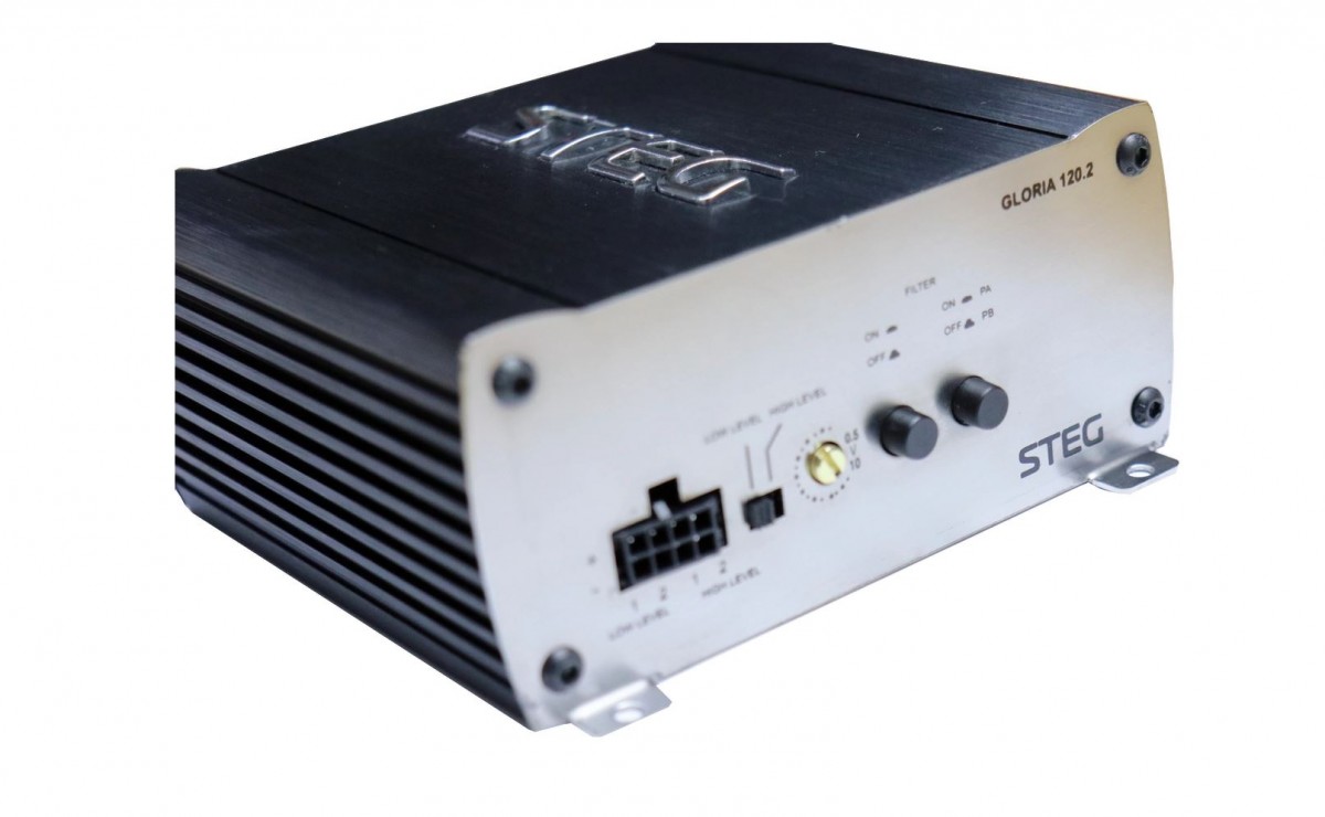 The latest addition from Steg - in 2020 the Gloria 120.2 amplifier was introduced, which was designed and manufactured 100% in Italy - one of the most powerful small amplifiers in the world with tonal characteristics comparable to class AB. The power of 2 x 100 W RMS into 4 ohms is controlled by a microprocessor, which, in addition to control, performs the function of thermal protection, low voltage protection and short circuit protection. It is also in charge of controlling the power mosfets. It has the ability to switch to low or high level with automatic switching on when the sound signal comes.| Catalog number | GLORIA 120.2 |