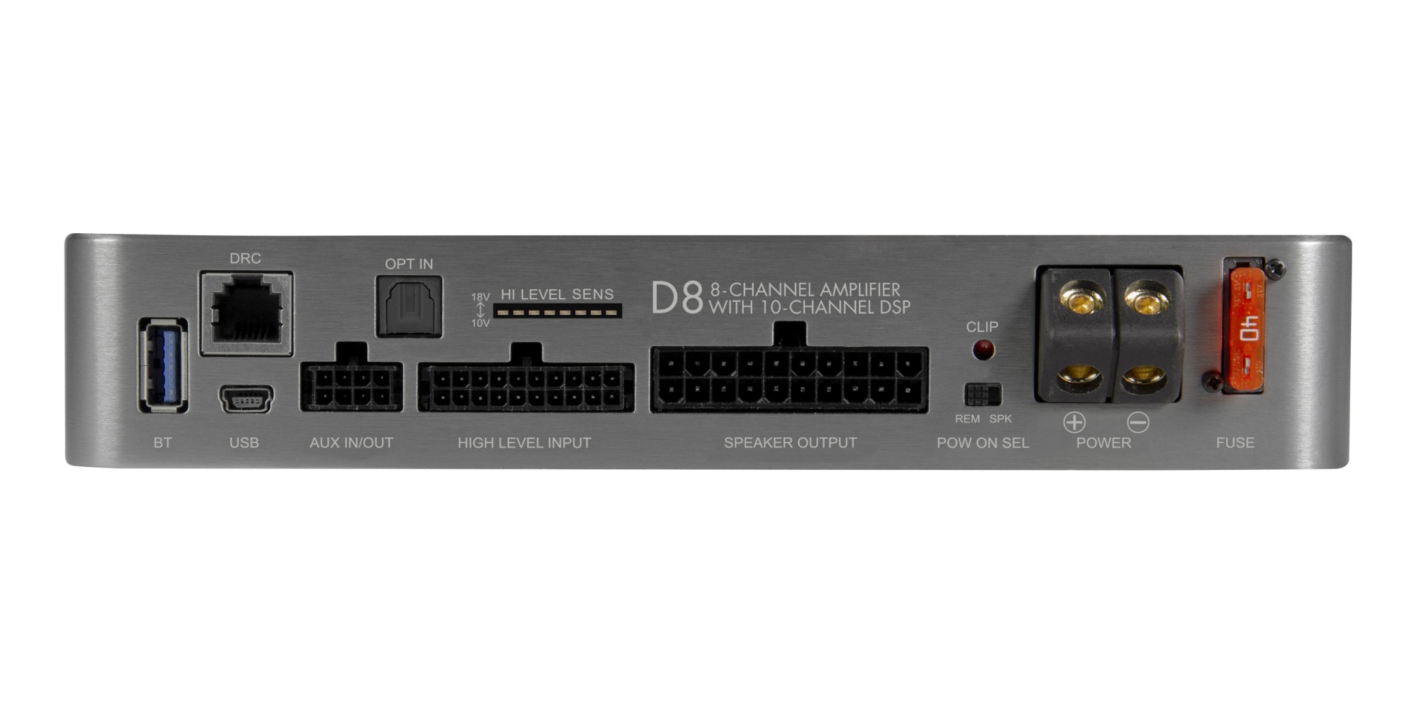 8-channel amplifier with DSP processor, 8 x 70 / 4 x 200 W RMS (4 Ω), class D, inputs: 8 x high-level, AUX, optical SPDIF, outputs: 2 x RCA, compact dimensions