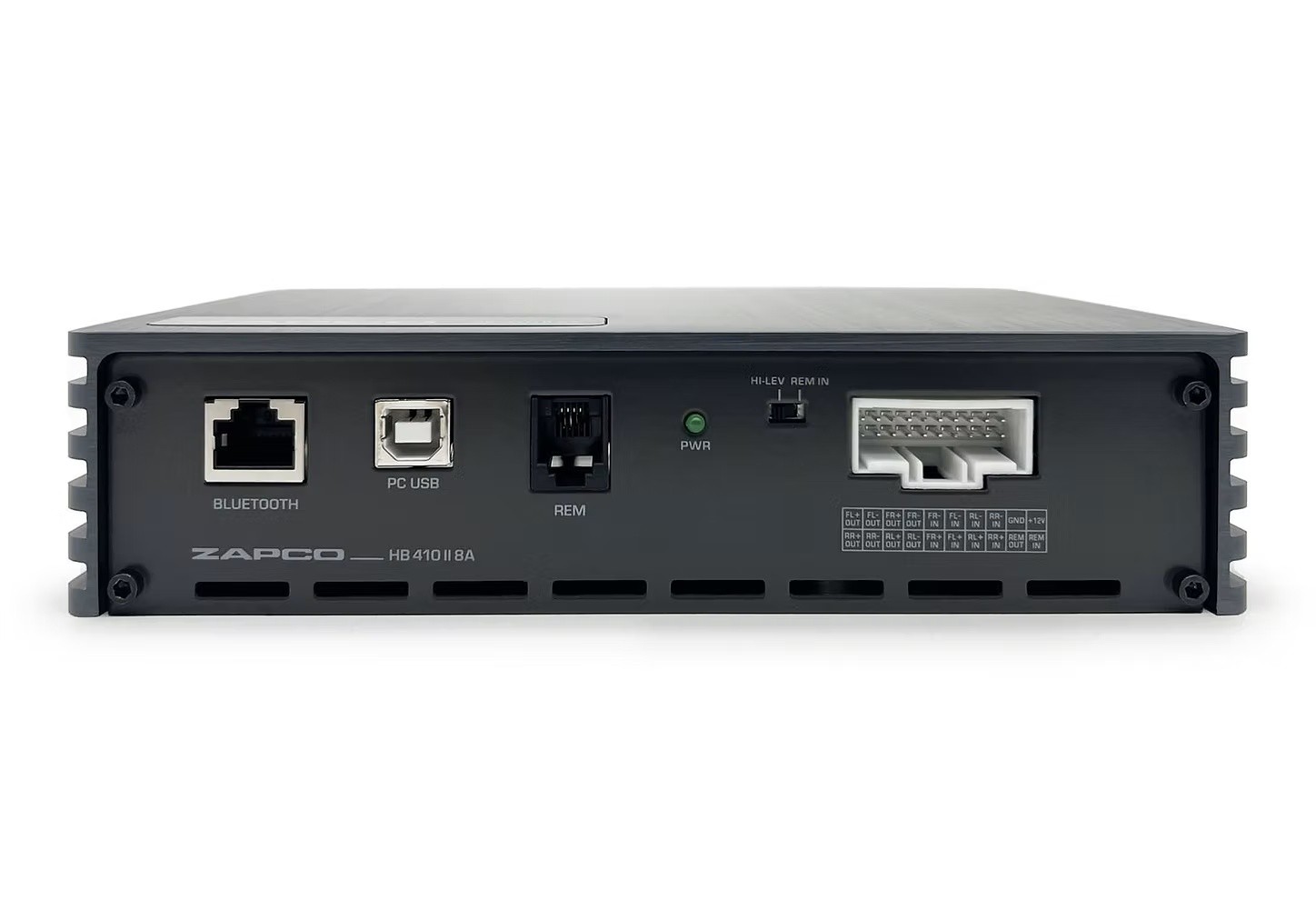 The Zapco HB 410 II 8A is an 8-channel amplifier with an integrated 10-channel DSP processor that combines exceptional sound quality with a compact design and easy installation. It offers a 31-band equalizer for fine acoustic tuning, advanced signal routing, adjustable delay, levels, polarity and crossover types. Thanks to the integrated Bluetooth 5.1 module it enables wireless music streaming and the new mobile app allows full control of the system directly from a smartphone. The built-in music player supports playback from USB devices including lossless formats. The Zapco HB 410 II 8A therefore represents a versatile solution for upgrading factory audio systems with maximum control and sonic purity.