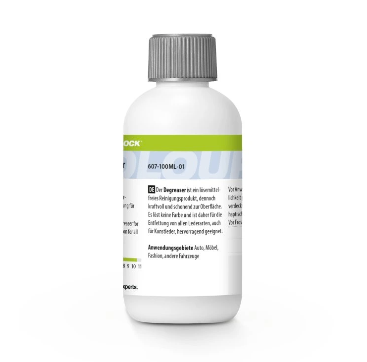 Solvent-free degreaser that effectively and gently cleans greasy spots on leather and synthetic leather without dissolving the paint, 100 ml