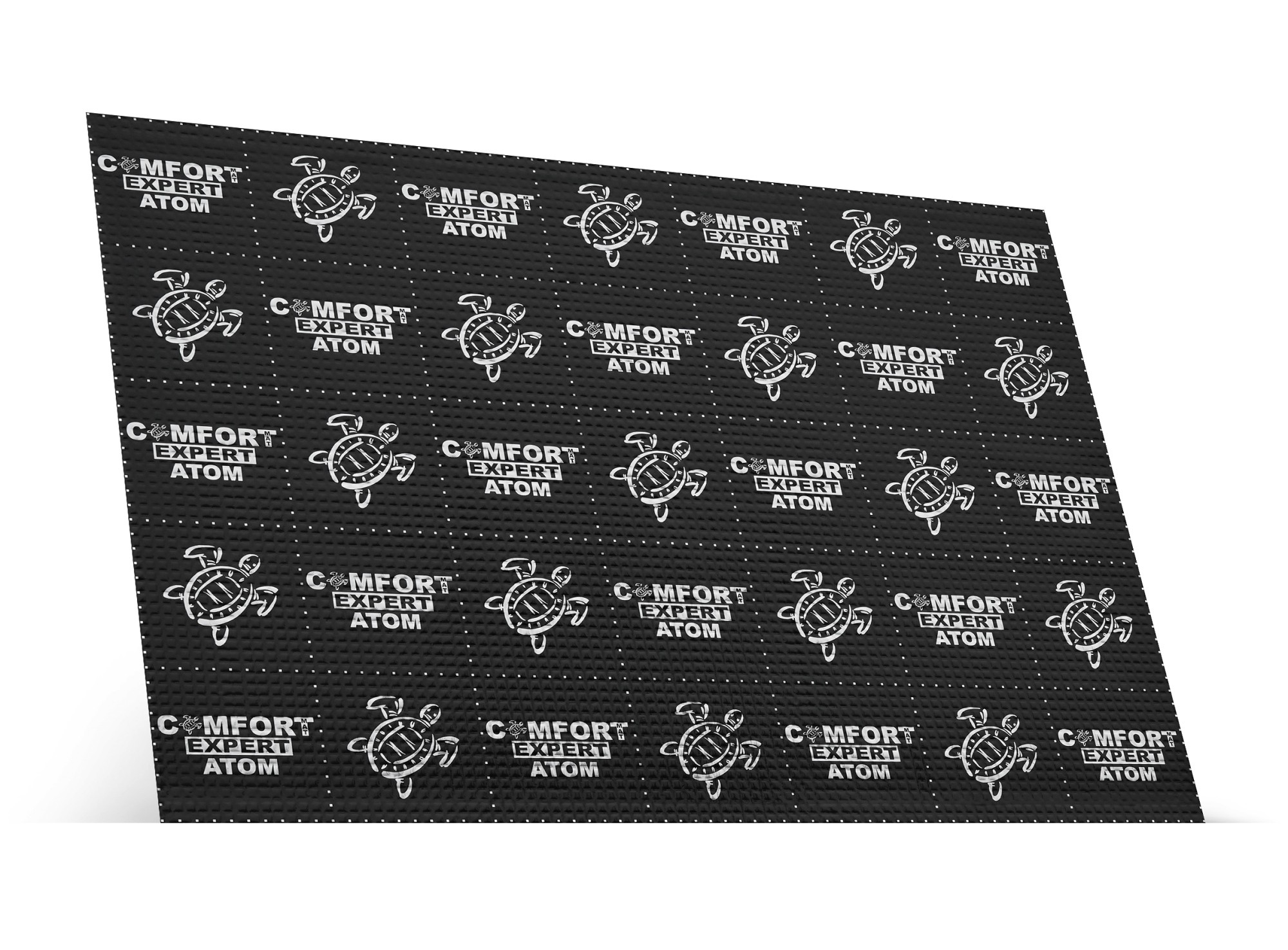 Professional anti-vibration material with a thickness of 4 mm from the top Expert range, which was completely redesigned in 2021. Atom consists of two types of newly developed sealants, each of which fulfills a different function. Two-thirds of the material consists of the upper layer of innovative bitumen, which has a 20% higher stiffness than the previous version and will allow the highest efficiency to filter out vibrations even in the most heavily loaded areas. The second layer, made of a special lightweight sealant, stands out in addition to its low weight for its extreme adhesion, which has been increased by 15%. The upper side is equipped with a strong aluminum foil with a square pressed structure for even higher material rigidity. The result is a top-quality anti-vibration material with an acoustic loss factor exceeding 0.60 units, which easily copes with vibrations and low-frequency noise. Atom is of course resistant to water, moisture, oils and extreme temperatures, has anti-corrosion properties and retains the same properties in winter and summer. For optimal comfort during work, we recommend heating the material to 50 degrees, but you can work comfortably even if it is stored at normal room temperature.Unique Comfortmat Atom material technology