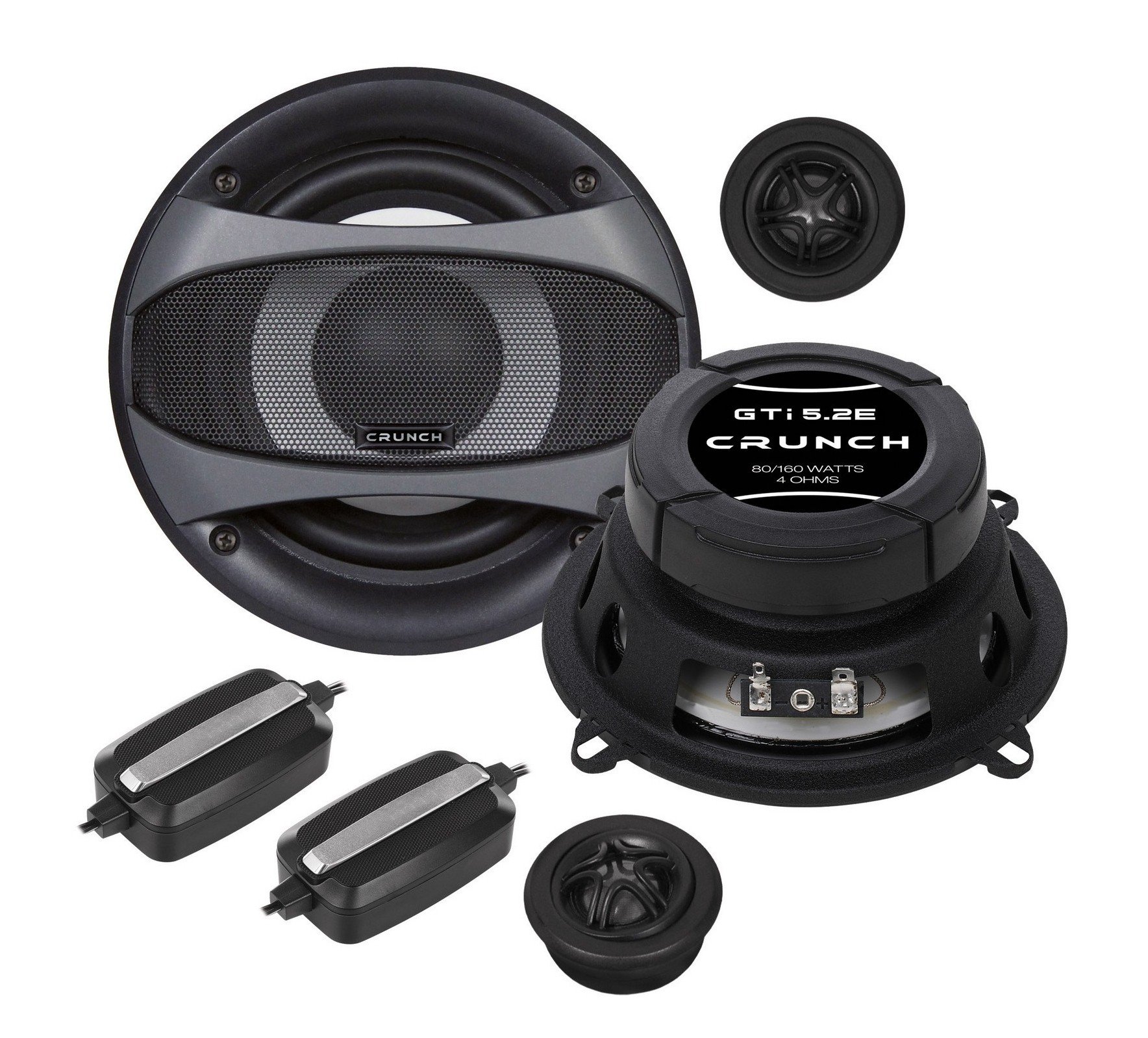The Crunch GTi5.2E component speakers are designed as an affordable solution for a basic vehicle audio upgrade and complement the brand’s amplifiers. The series stands out with a modern look featuring white polypropylene cones and stylish protective grilles, while retaining a simple and functional construction. Thanks to medium mounting depth, the speakers can be used in standard factory locations without major door modifications. The foundation is mid-woofer drivers with polypropylene cones mounted in a stable steel basket, complemented by a robust magnetic cover. High frequencies are handled by 25 mm textile neodymium tweeters. The package includes compact 12 dB crossovers.