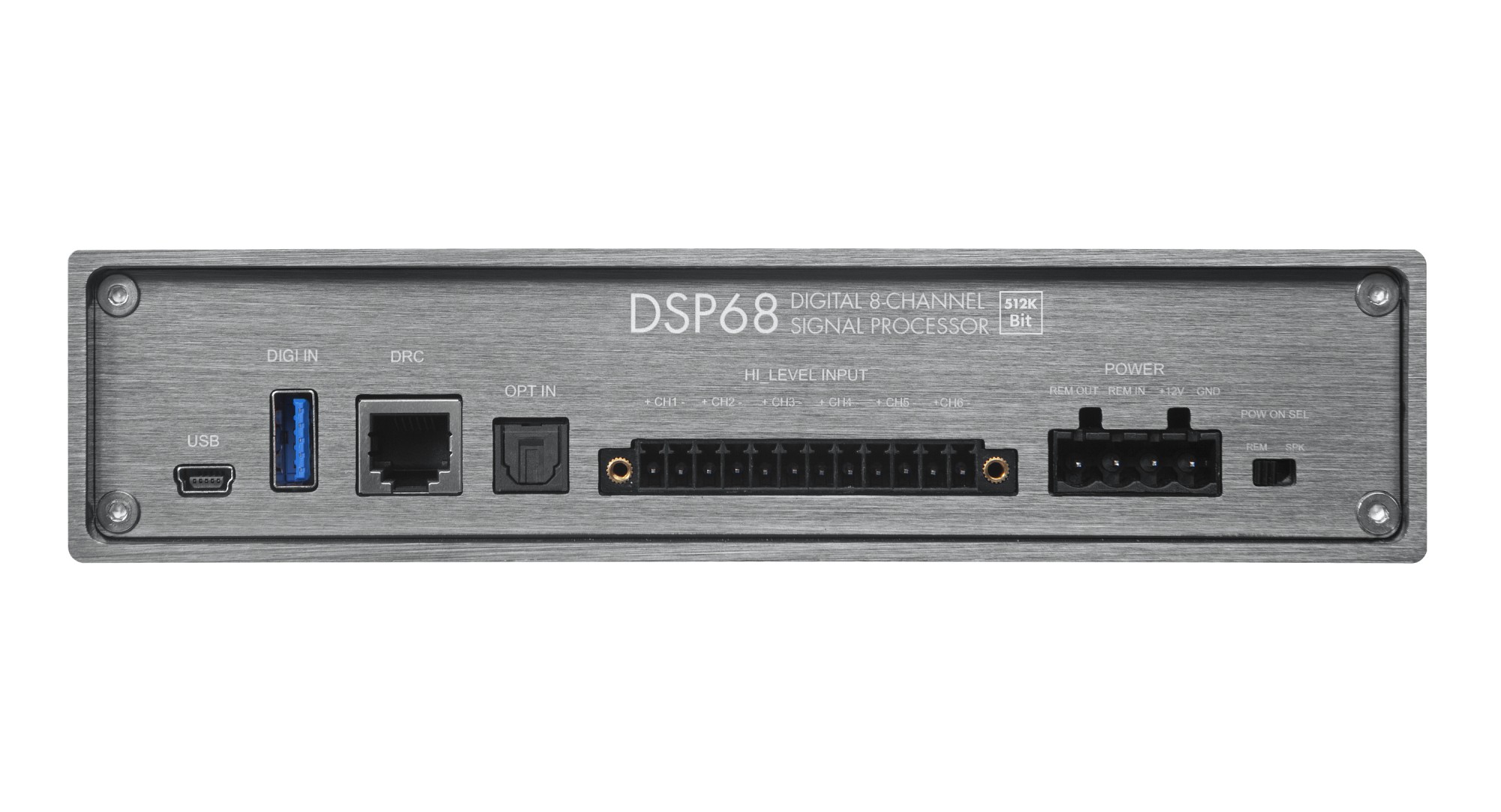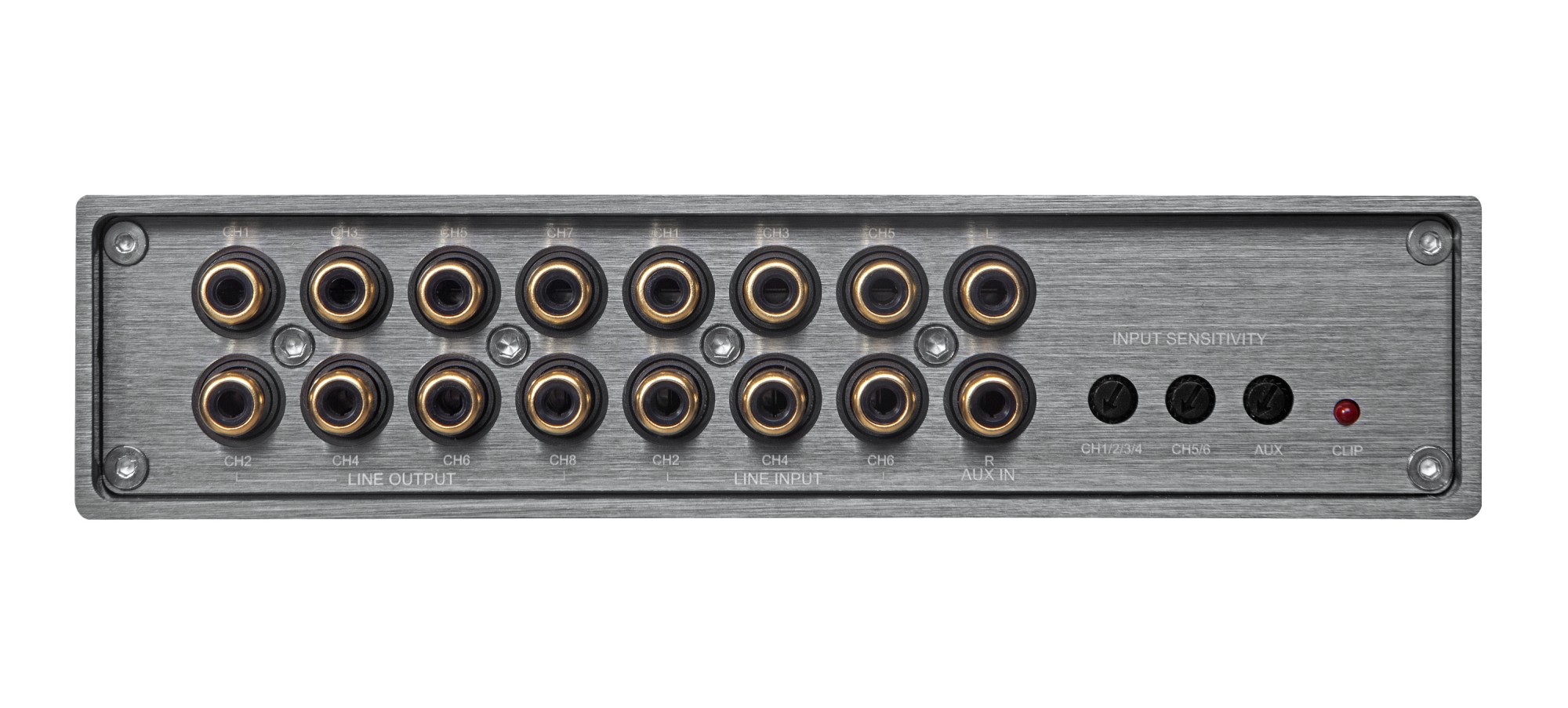 8-channel DSP processor, inputs: 6 x high-level, 6 x RCA, AUX, optical SPDIF, outputs: 8 × RCA, Hi-Res BT option