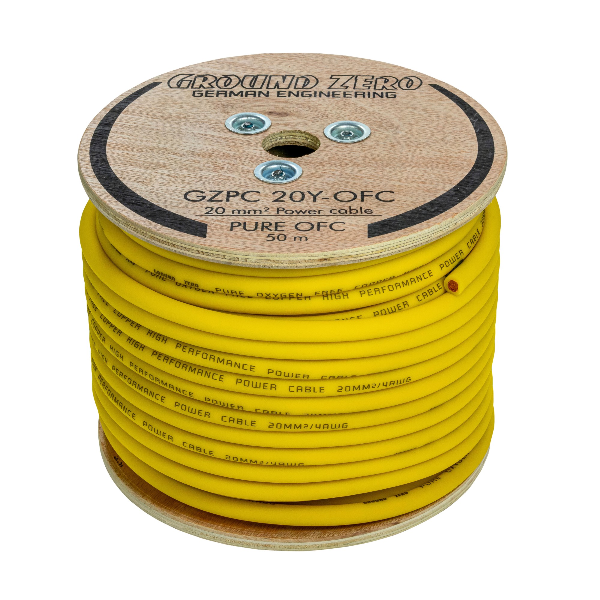 Ground Zero GZPC 20Y-OFC is a high-quality power cable with a 20 mm² cross-section, designed for demanding audio installations. The conductor is made of pure oxygen-free copper (OFC – Oxygen Free Copper), which ensures minimal contact resistance, high conductivity and long-term stability even at high currents. Compared to cheaper CCA cables it provides significantly lower voltage drop, better power transmission and greater resistance to oxidation. Thanks to the highly flexible insulation the cable is easy to work with even in confined vehicle spaces. The robust yellow jacket provides mechanical resistance, abrasion protection and long service life even in professional installations. The cable is wound on a wooden spool and supplied per 1 meter.