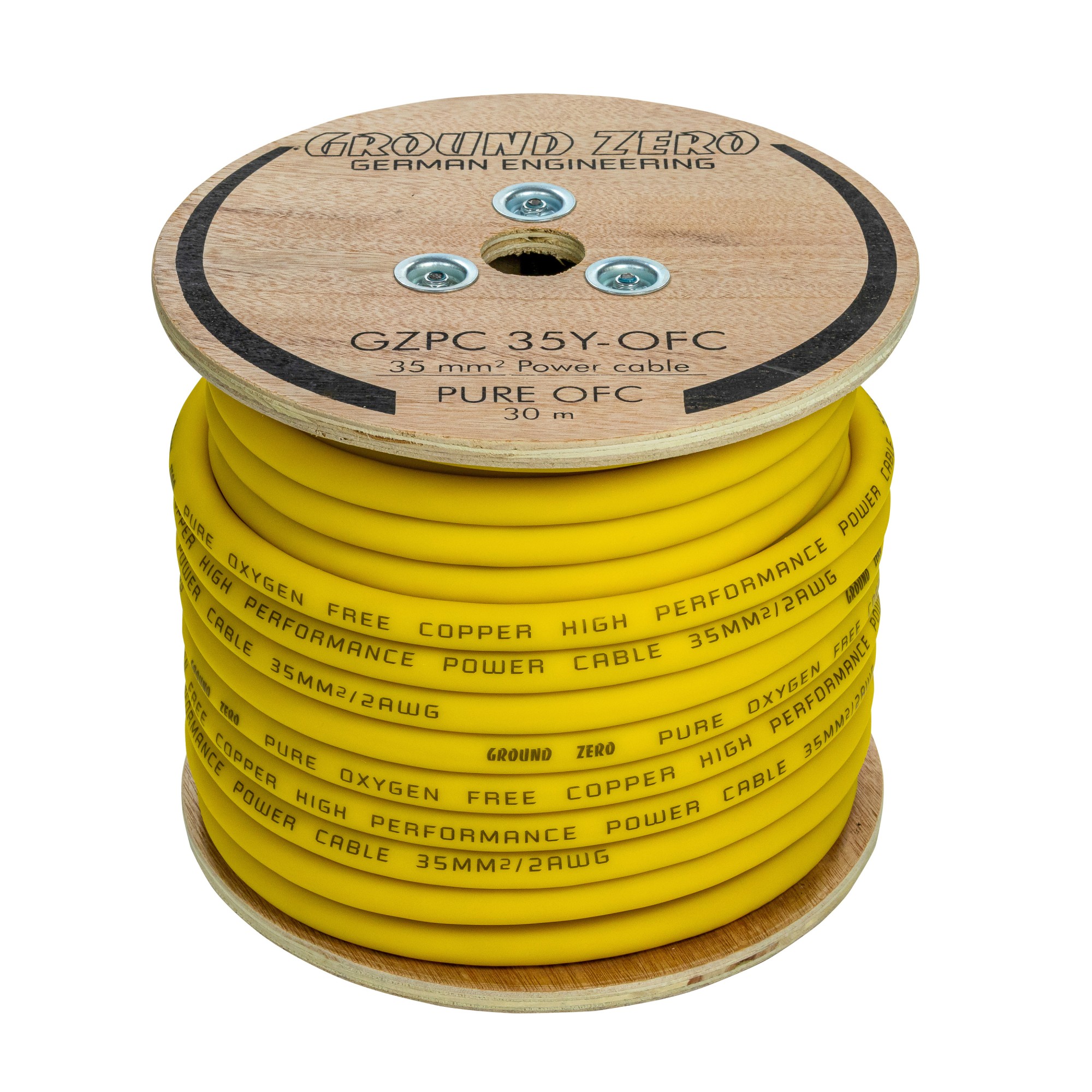 Ground Zero GZPC 35Y-OFC is a high-quality power cable with a 35 mm² cross-section, designed for demanding audio installations. The conductor is made of pure oxygen-free copper (OFC – Oxygen Free Copper), which ensures minimal contact resistance, high conductivity and long-term stability even at high currents. Compared to cheaper CCA cables it provides significantly lower voltage drop, better power transmission and greater resistance to oxidation. Thanks to the highly flexible insulation the cable is easy to work with even in confined vehicle spaces. The robust yellow jacket provides mechanical resistance, abrasion protection and long service life even in professional installations. The cable is wound on a wooden spool and supplied per 1 meter.