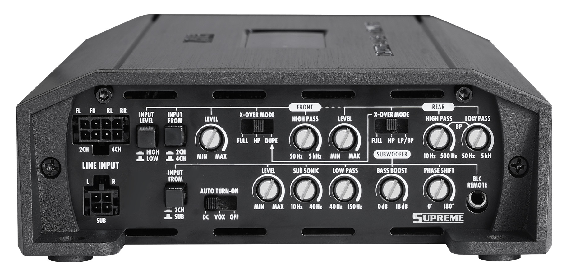 5-channel amplifier, 4 x 70 / 1 x 200 W RMS (4 Ω), 4 x 100 / 1 x 325 W RMS (2 Ω), 1 x 500 W RMS (1 Ω), class D