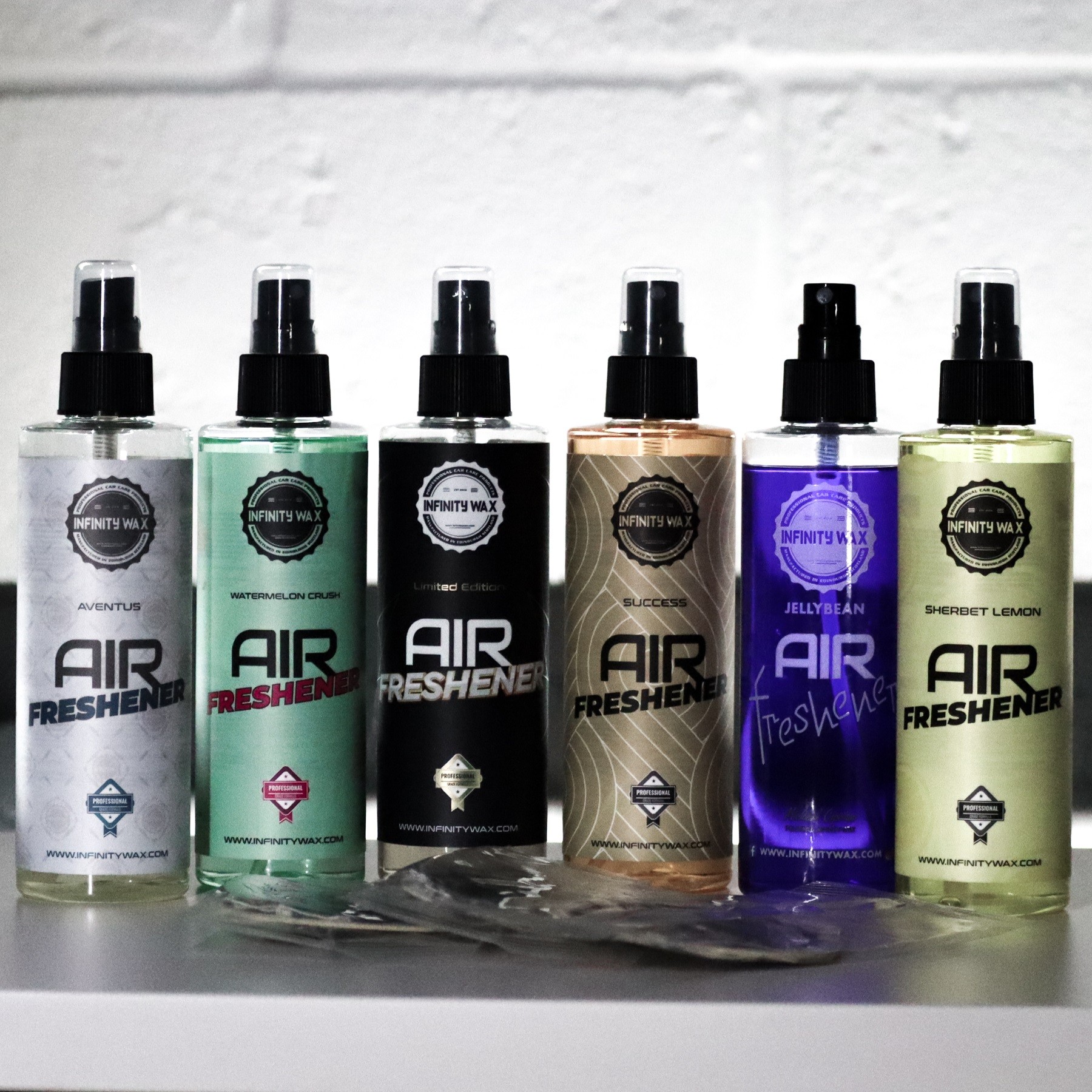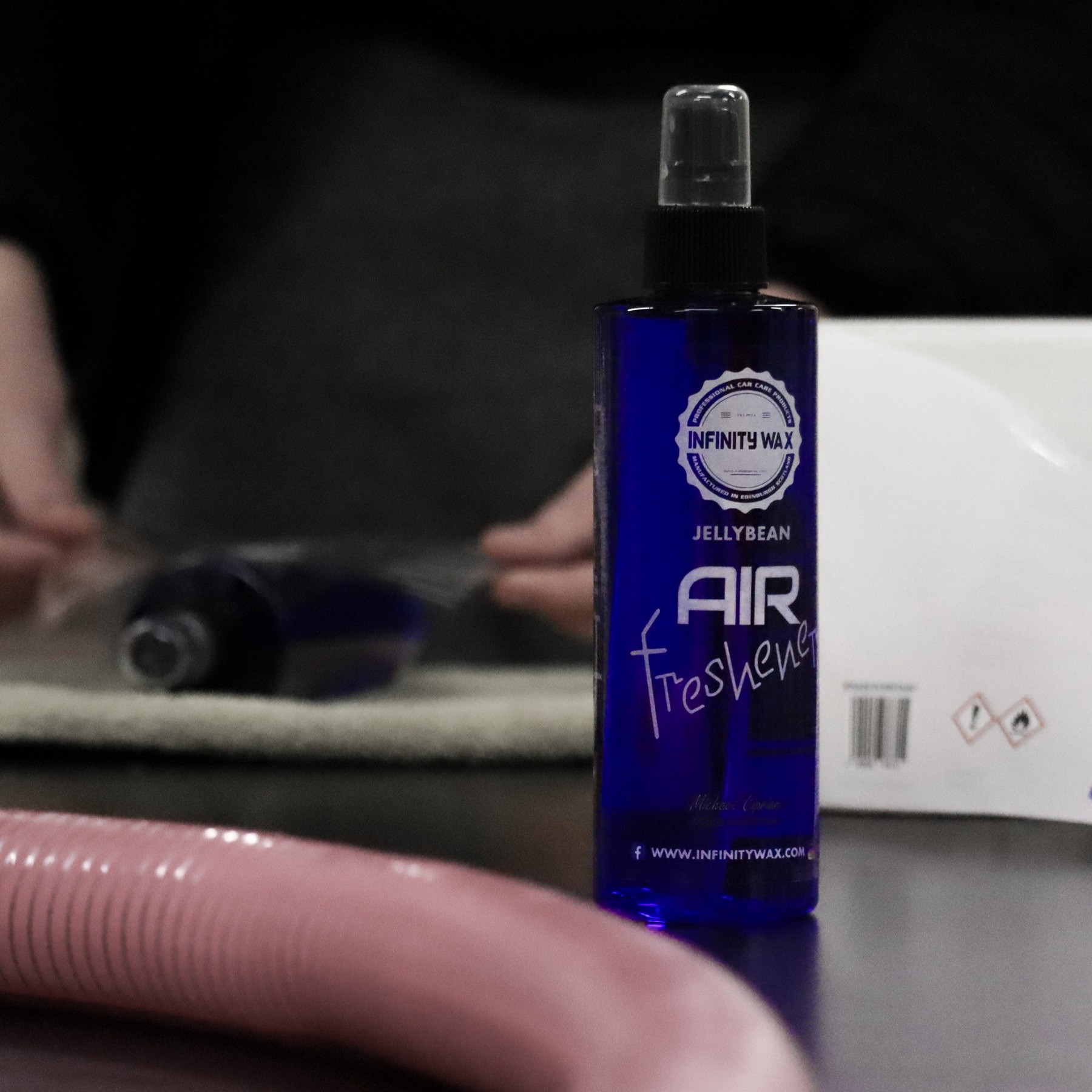 A water-based air freshener that delivers the sweet scent of gelatin candies. You can spray the air freshener freely into the interior of your vehicle for an intense scent, or directly onto the carpets. It's a scent that lasts for weeks. The air freshener is only intended for use in the interior of the car.How to use Infinity Wax air freshener