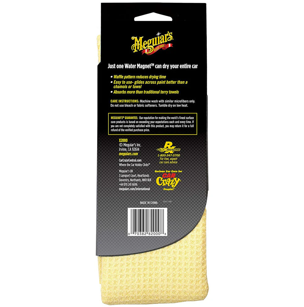 Meguiar's Water Magnet Microfiber Drying Towel is an exclusive microfiber drying towel that absorbs up to three times more water than regular microfiber towels! It is also larger than regular microfiber towels, exactly 76 x 55 cm. The special, highly absorbent microfiber construction ensures perfect drying and absorption capabilities, making car drying not a chore, but a fun part of your regular car maintenance on the way to a perfect look that everyone will admire.Drying is a very important step that should always follow immediately after washing the car. By properly drying your car, you will prevent the formation of unsightly stains, limescale and prepare the surface for treatment. You can dry your car completely safely and effectively with this luxurious, extra absorbent towel. The towel has a so-called "waffle pattern", which ensures that the car will not be scratched when drying, even when working in an open area outside the car wash or garage. Try a towel that is sought after not only by car enthusiasts, but also by professionals from all over the world for its efficiency and ingenious simplicity of use.