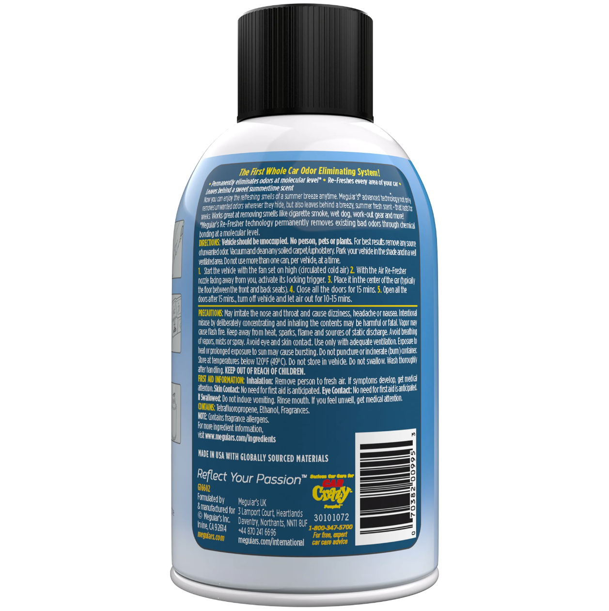 Meguiar's Whole Car Air ReFresher Odor Eliminator - New car Scents (71 g)In stock (220 pcs) 17,99 EURA new version of the popular Meguiar's air conditioning cleaner - Summer Breeze fragrance. This product is intended for easy and very effective cleaning of the air conditioning and removal of unwanted odors in the interior of the car. Unlike conventional cleaners and odor absorbers, the aerosol does not fall to the floor of the car, but circulates throughout the interior and the air conditioning system, which guarantees high efficiency even in hard-to-reach places, as well as vertical surfaces and ceilings.