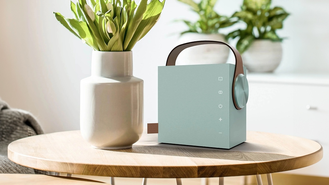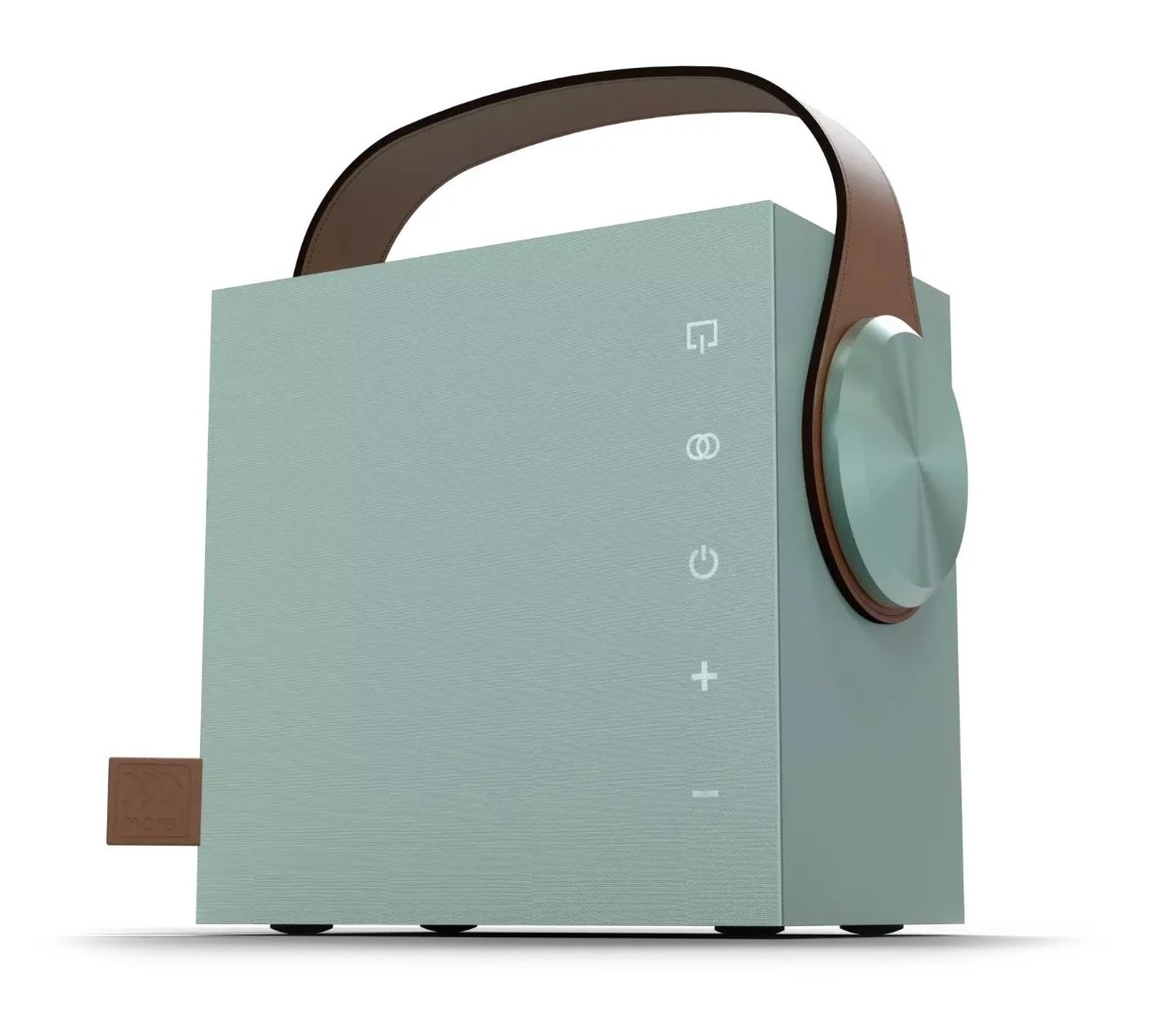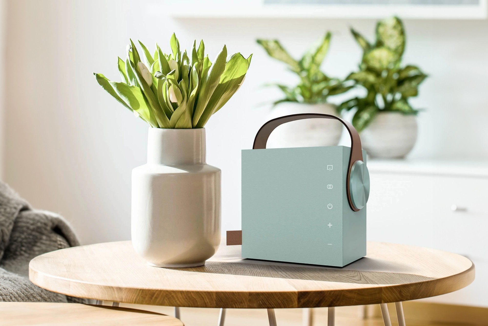 The Biggie design combines minimalist aesthetics with practical details. The compact square shape follows the Högtalare model design, this time in a smaller and easily portable execution. A handle with a leather-like (animal-friendly) surface makes carrying easier and can also be removed. Biggie is available in a wide range of color variants that allow you to match the speaker to your interior or personal style. Available variants include black, white, red, dark blue, golden yellow, light blue, olive green and turquoise; for lovers of natural materials there is also an elegant oak-finish version.