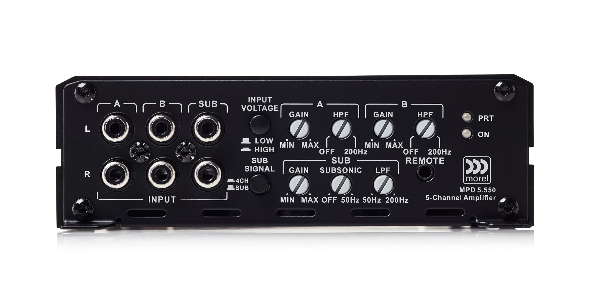 5-channel amplifier, 4 x 75 + 1 x 250 W RMS (4 Ω)/ 4 x 110 + 1 x 400 W RMS (2 Ω), class D