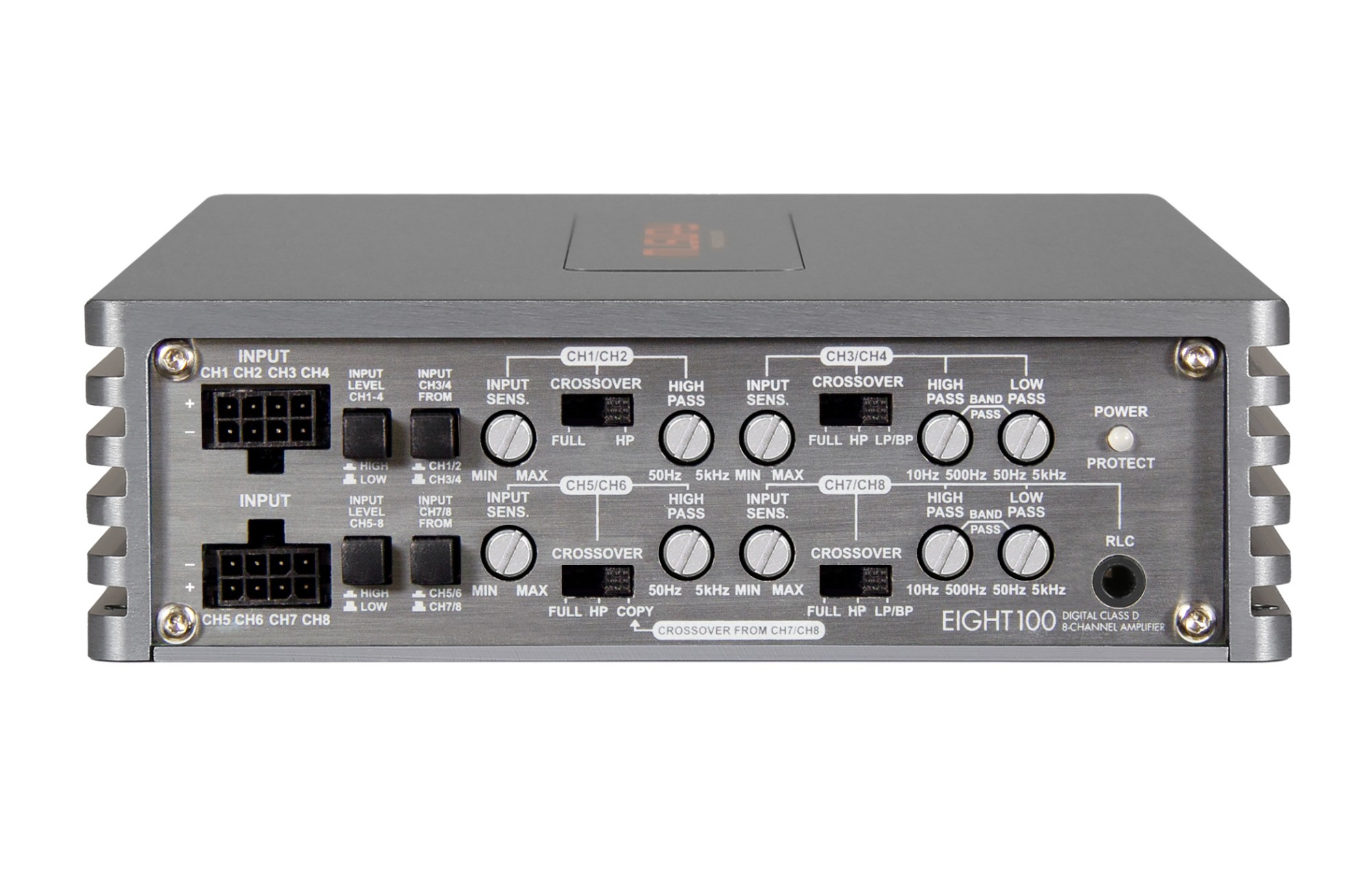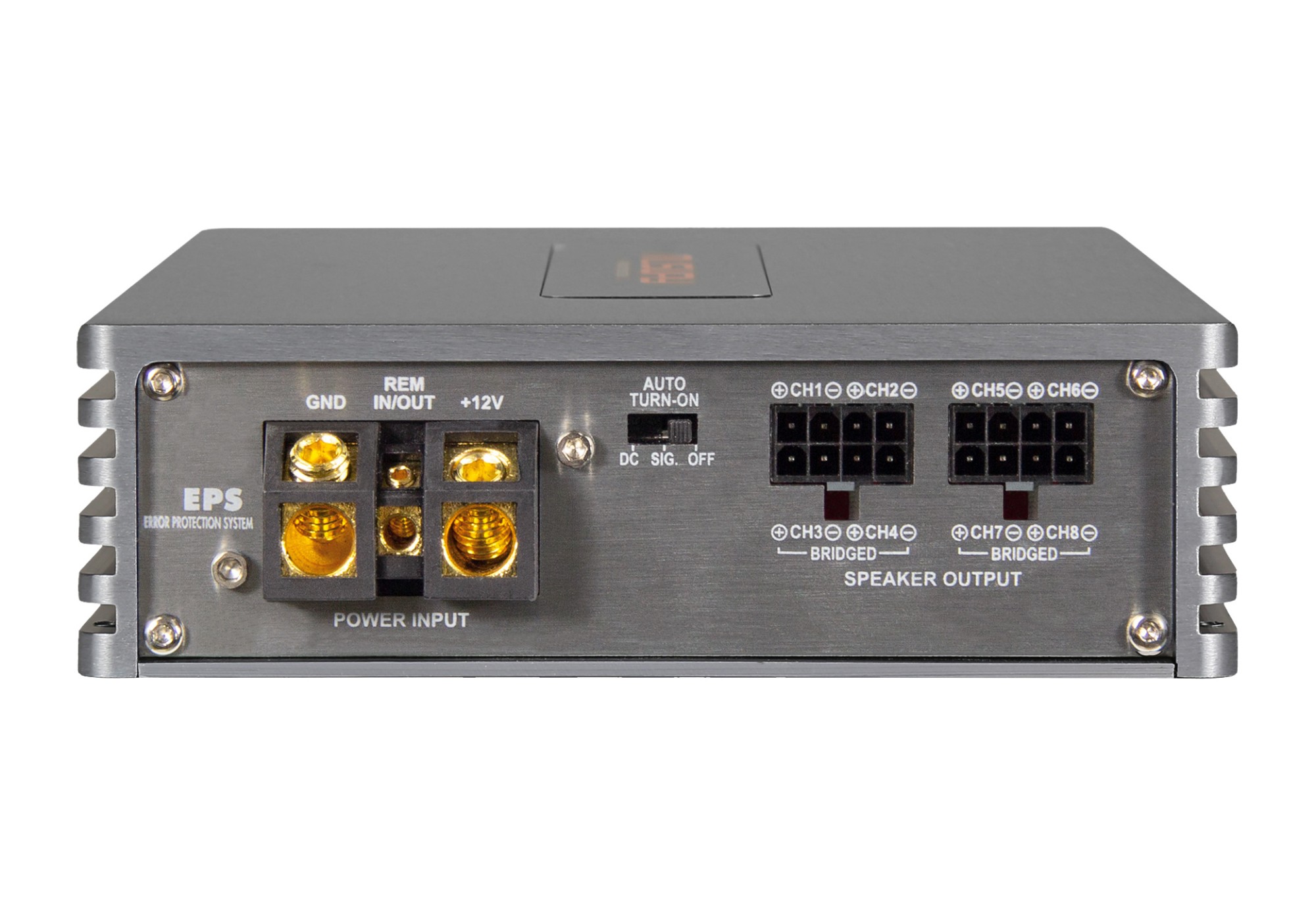 8-channel amplifier, 8 x 100 / 4 x 360 W RMS (4 Ω), class D, remote control