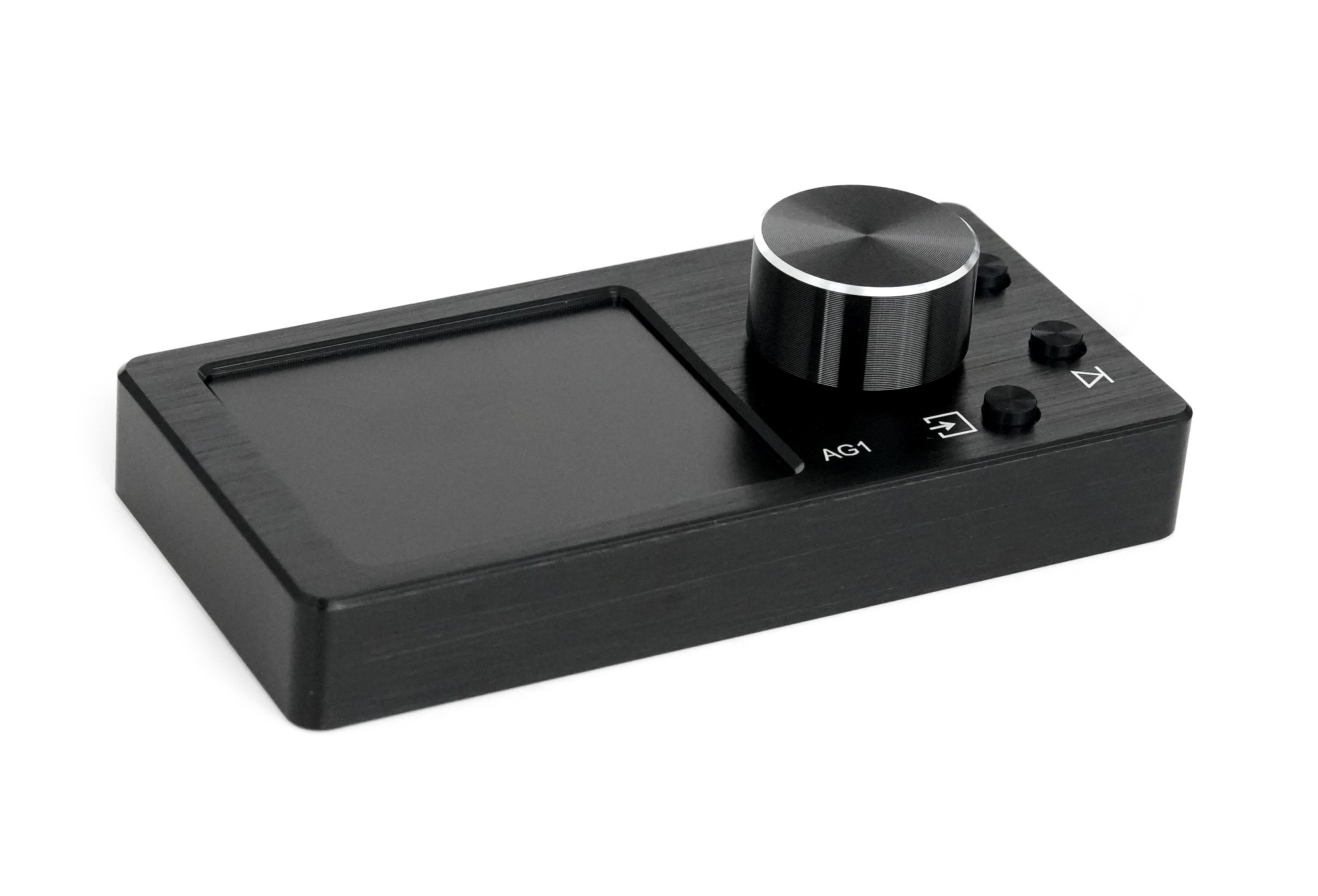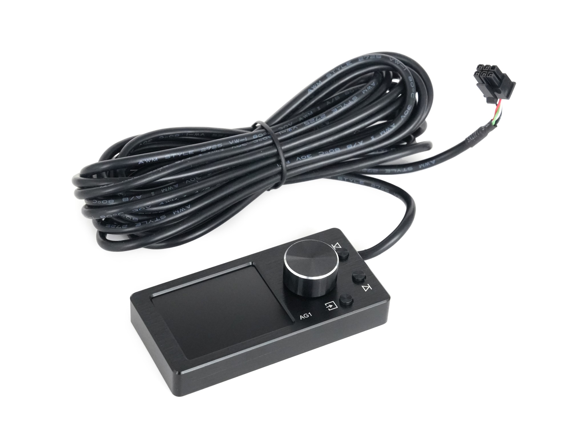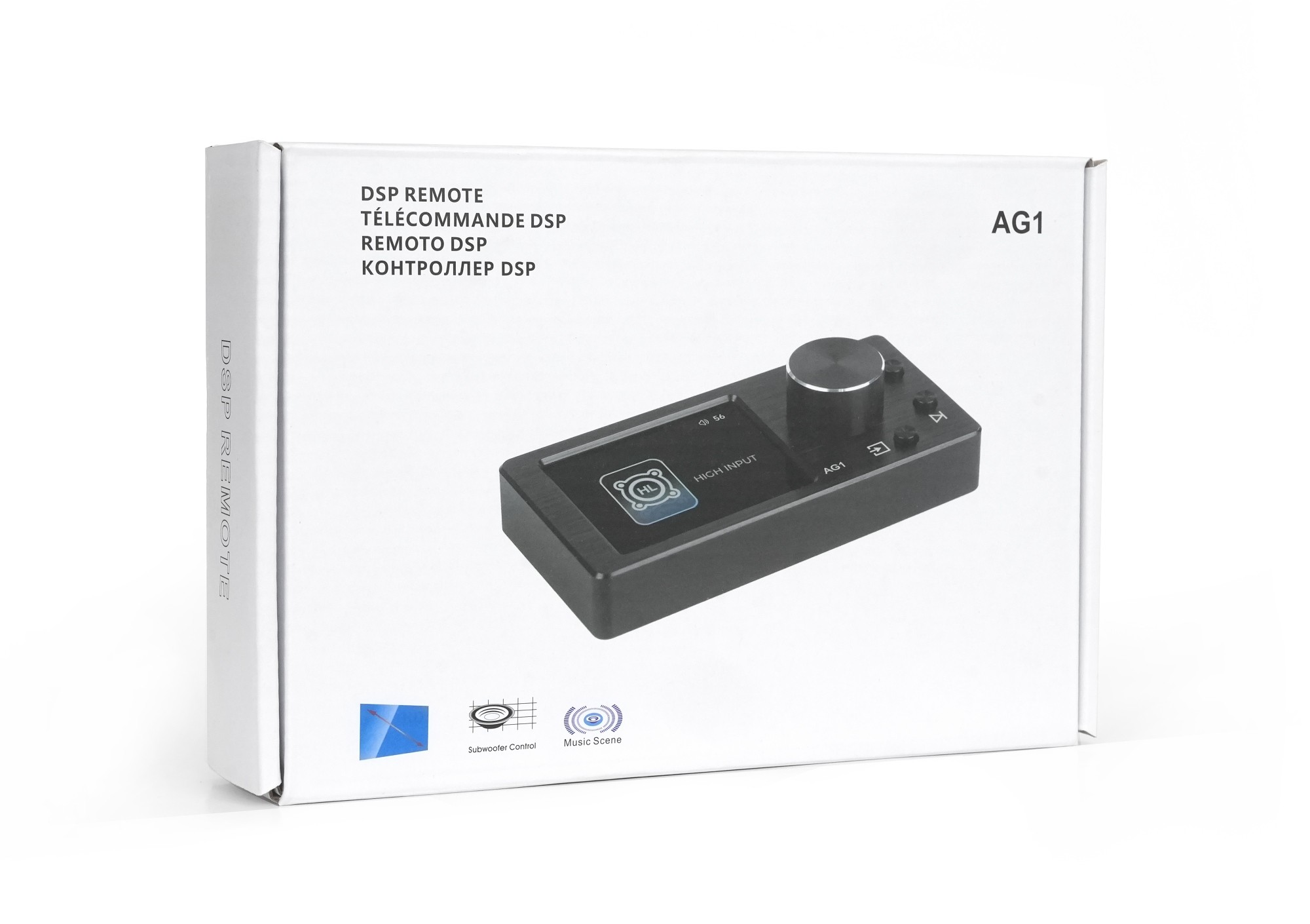 The Nakamichi AG1 is an external remote control designed to operate compatible Nakamichi DSP processors. It serves as a convenient interface for quick adjustment of volume, subwoofer level and switching stored scenes without the need to connect to an app or computer. Thanks to its compact dimensions and integrated display, it is suitable for both concealed and visible mounting inside the vehicle. The controller is equipped with a 2" HD display that shows the current signal source, volume, scene number and information about the playing track. The central rotary knob provides smooth adjustment of the main volume and, when switched, the subwoofer volume. A short press mutes the system, and a long press activates the subwoofer adjustment mode. Dedicated buttons allow track switching, source selection and DSP scene changes. Scene switching is performed by pressing and holding the button for approximately 3 seconds; afterwards, short presses of the previous/next track buttons immediately toggle between stored scenes and load them directly. This is ideal, for example, for quickly switching between daily listening, a louder mode or a demo setting.