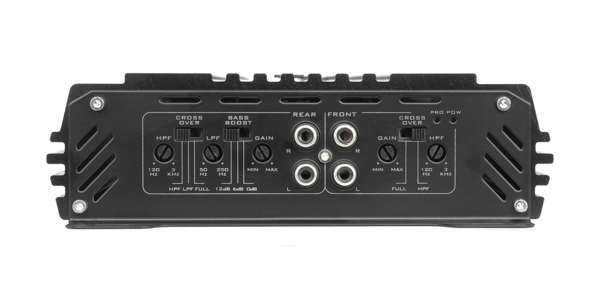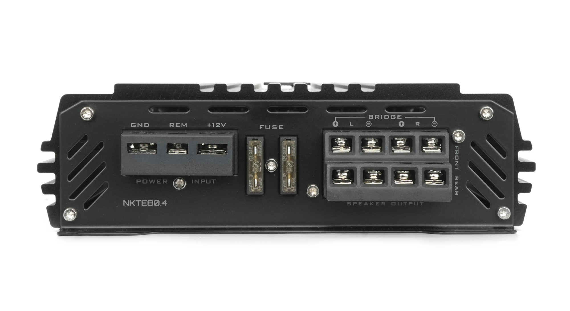 The Nakamichi NKTE80.4 is a four-channel class AB amplifier designed for users seeking a balanced mix of power, sound quality and reliability. Both in construction and sound it targets classic installations where emphasis is placed on clean reproduction, good dynamics and a natural character without the harshness typical of cheaper class D amplifiers. The amplifier delivers 4 × 80 W at 4 Ω and in bridged mode can provide 2 × 240 W at 4 Ω, allowing flexible use – from powering component speakers to combining front stage speakers with a small subwoofer. Thanks to this versatility, the NKTE80.4 is suitable for basic upgrades as well as more thoughtful multi-stage installations. The NKTE80.4 is equipped with integrated high-pass and low-pass filters, enabling basic crossover settings directly on the amplifier. Full-range operation is also available. Controls are clearly arranged and allow easy adjustment of gain and filtering without additional electronics, which is particularly useful for simpler installations without a DSP processor. The amplifier is built in a sturdy aluminum chassis that serves both as mechanical protection and an effective heatsink. The ribbed top design ensures good heat dissipation and stable operation even under prolonged load. Due to its compact dimensions, the amplifier is suitable for installation in limited spaces, for example under seats or in side luggage compartments. The NKTE80.4 thus represents a solid and reliable foundation for a quality car audio system.