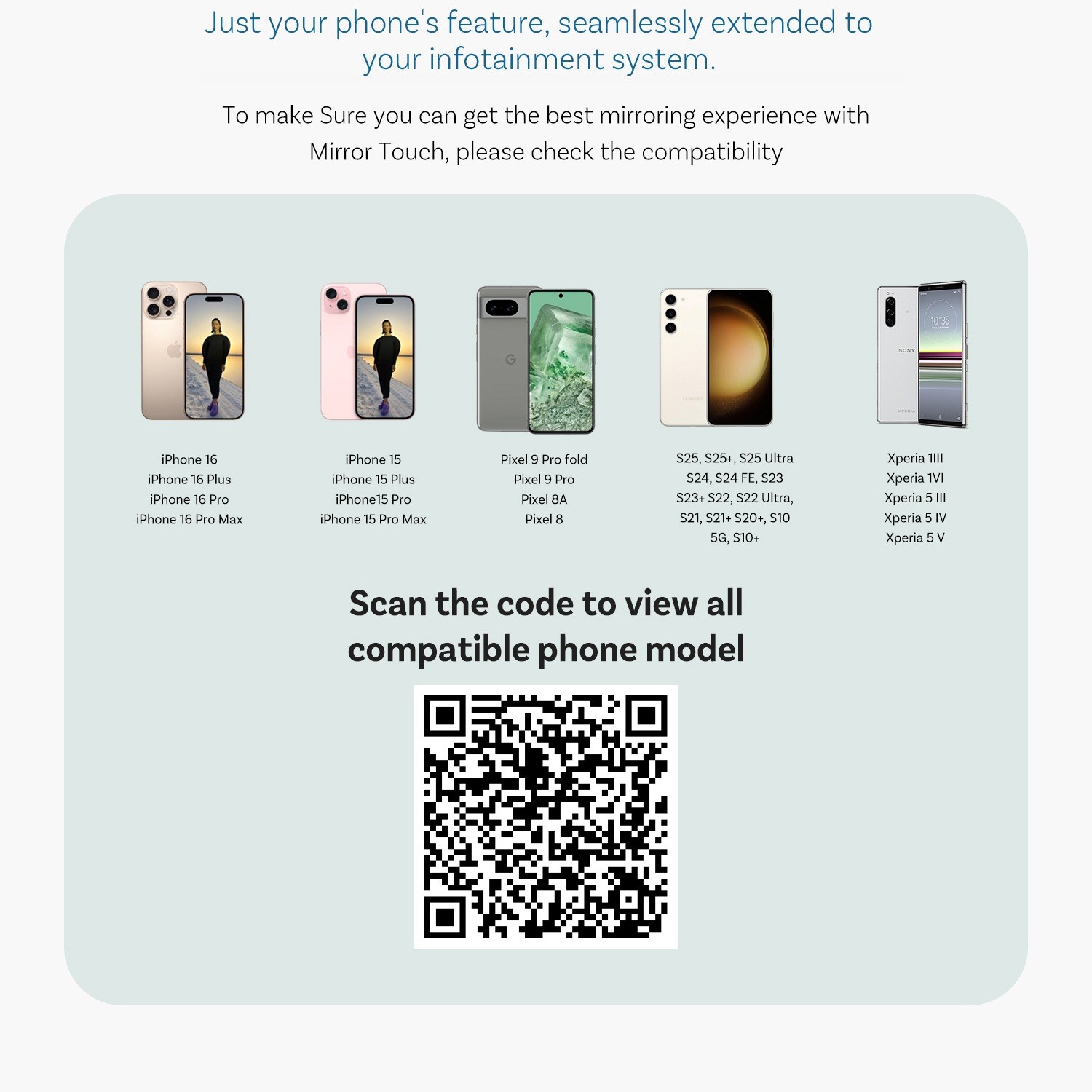 CA450 supports Android smartphones with DP (DisplayPort) technology and iPhone 15 and 16 series, allowing you to mirror the phone display to your car screen. Check whether your device supports screen mirroring via DP. Some phones require manual activation of the "DeX" function from the notification/status bar.