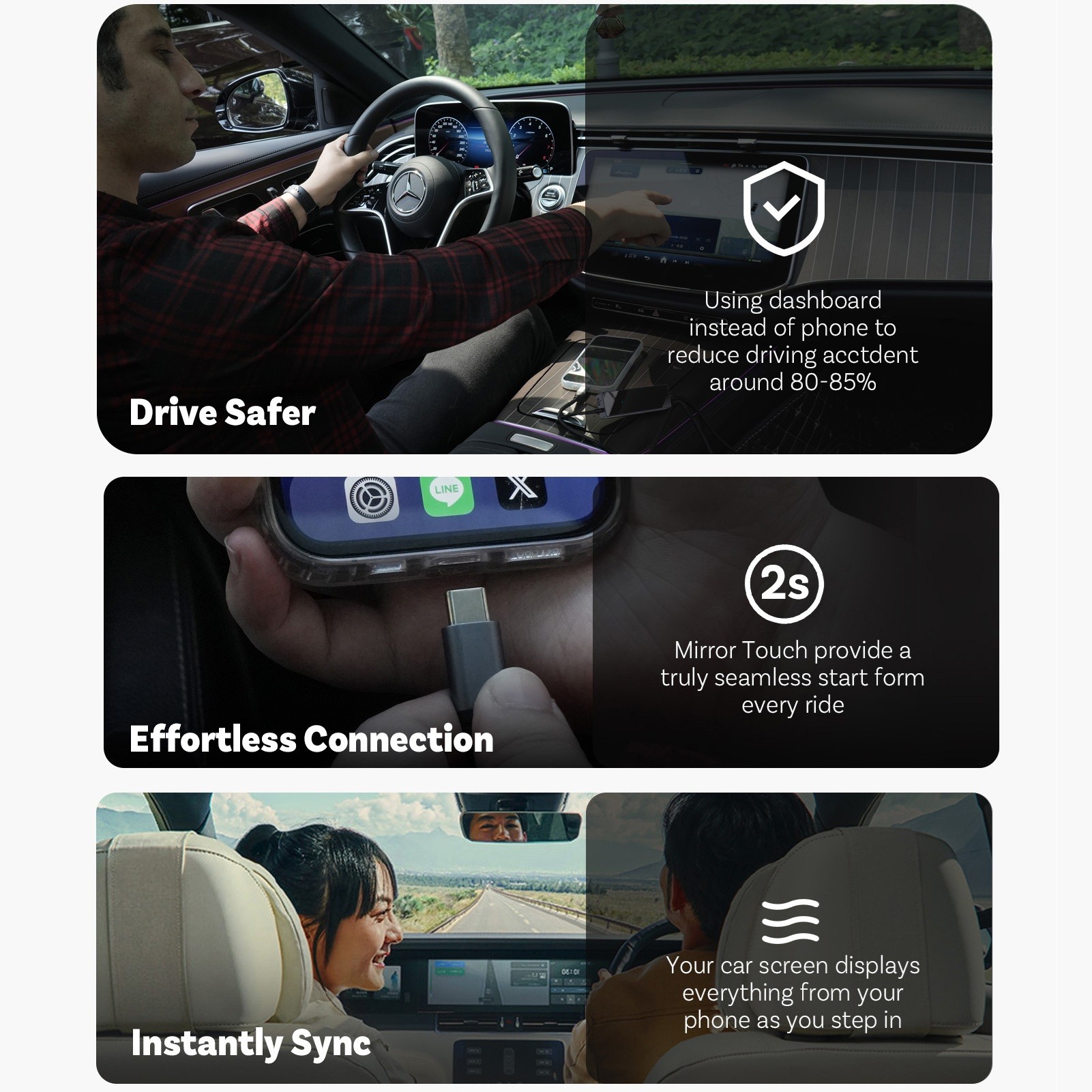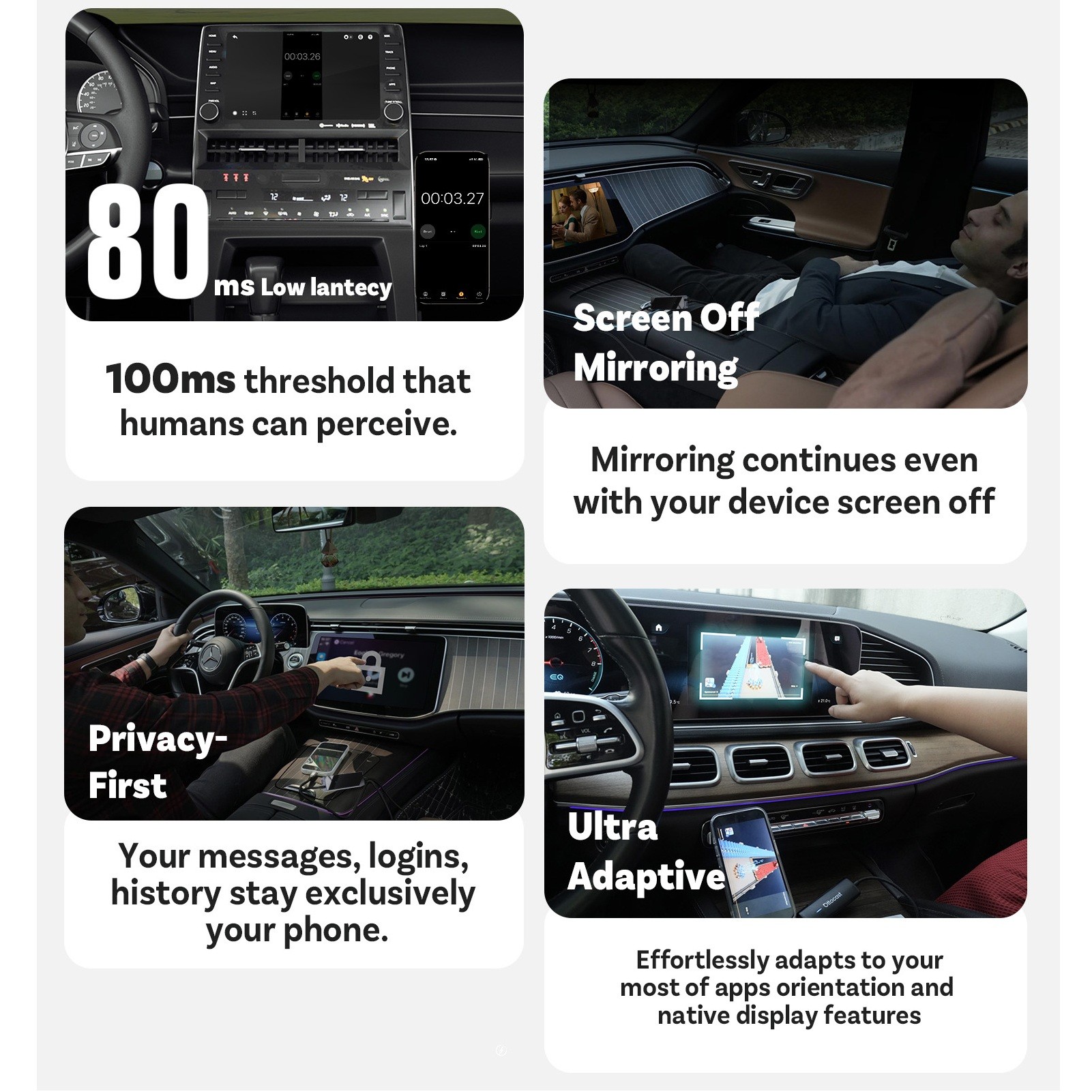 Mirroring provides features focused on safety and performance. All your messages, login credentials, history and data remain stored exclusively on your phone, ensuring maximum personal data protection. With a display latency of only 0.08 seconds, which the human eye cannot perceive, use is fast and smooth. The highly adaptive technology ensures the system automatically switches to full-screen orientation for most apps and display functions, allowing you to take full advantage of your phone.
