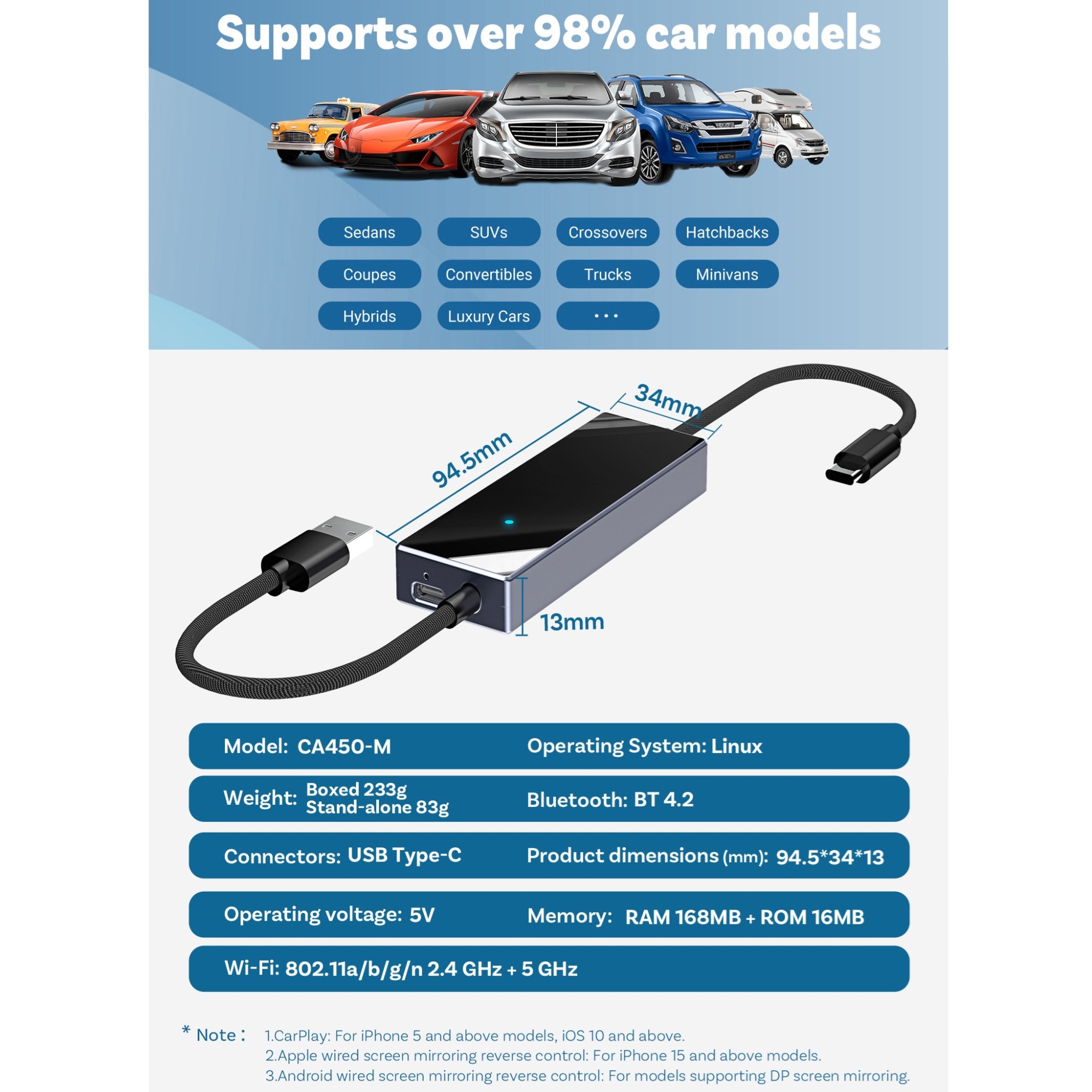 Universal module for unrestricted phone content mirroring over a USB connection. Faithfully mirrors your smartphone display to your car screen. Supports Android phones with DP (DisplayPort) capability as well as iPhone 15 and 16 series. CA450 also enables wireless connection of the phone to Apple CarPlay / Android Auto. The module is designed for vehicles with a wired Apple CarPlay / Android Auto head unit. In addition to unrestricted phone mirroring over USB, the module also allows wireless connection to Apple CarPlay / Android Auto. Control of supported apps is preserved via the vehicle touchscreen, steering wheel buttons, or other existing controls. Simple installation — plug into the vehicle USB slot intended for the phone. The phone connects to the vehicle head unit through the module automatically (after initial Bluetooth pairing).