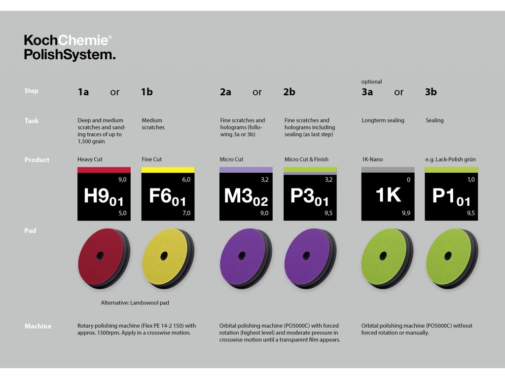 Abrasive polishing disc for polishing heavily weathered paintwork and removing deep scratches using the Heavy Cut H9.01 polishing paste. The small height of 23 mm causes low torsional forces, enables very good handling and the highest stability. The special density of the foam material allows for long-lasting stiffness with proportional compression during polishing. The milled edge allows for greater flexibility of the wheel and thanks to this the polishing wheel adapts better to the transitions of the body. The color marking of the polishing wheel is the same as the color marking of the polishing paste. This will further enhance proper use.