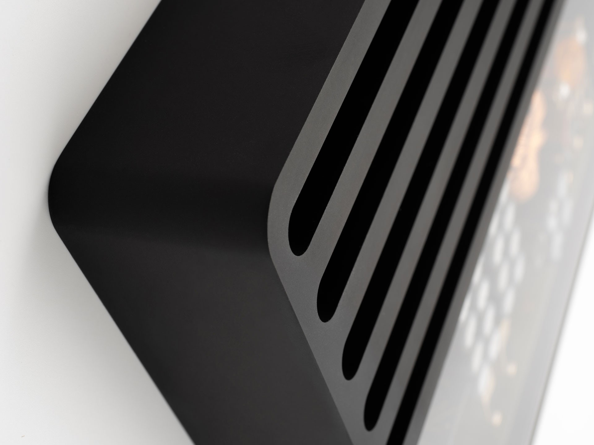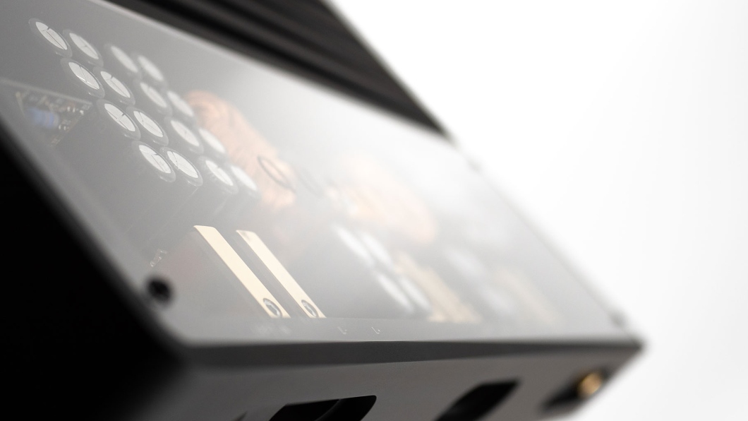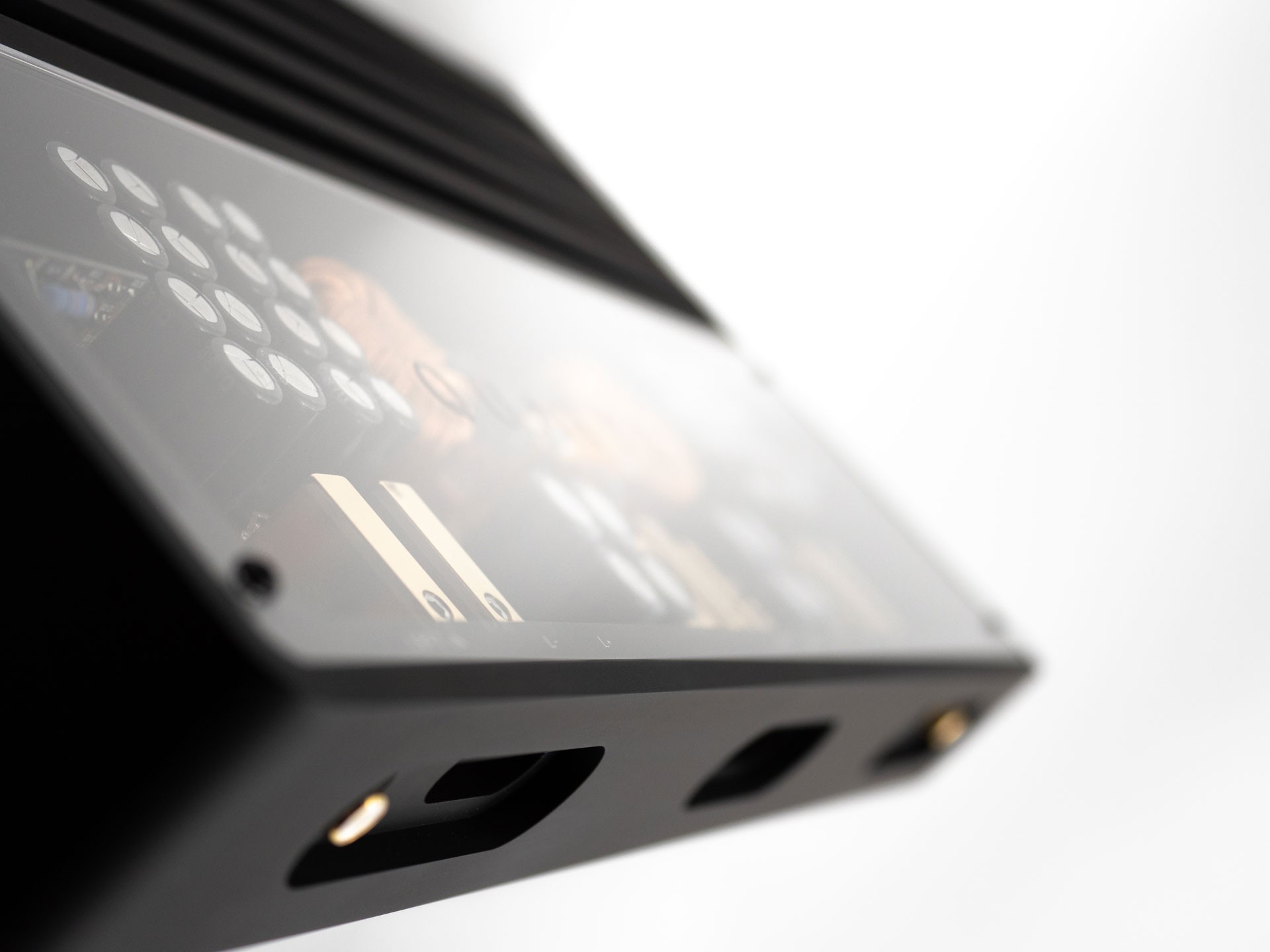 Visually, the amplifier is divided into a massive aluminum heatsink and a glassed top section that reveals the internal construction and precise component layout. Golden terminals add a subtle luxury accent. The result is a design that is simple yet extraordinarily elegant.