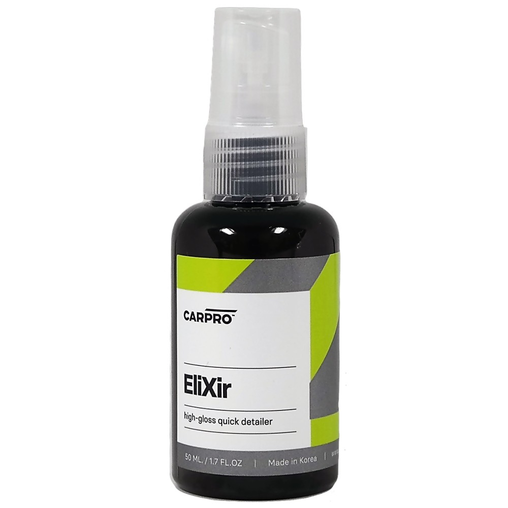 Imagine a Quick Detailer that applies as easily as CarPro ECH2O , is super hydrophobic and lasts for weeks! CarPro EliXir is a blend of nanotechnologies that create a mirror-like deep shine and enhance every shade of paintwork. It is suitable not only for paint, but also for all other surfaces - plastic parts, glass and wheels. It was created by combining the technologies of three great preparations (ECH2O, Reload and HydrO2), which have one thing in common - an emphasis on maximum results with minimal effort. EliXir can leave a truly breathtaking finish. The depth of shine, plasticity and color saturation can be compared to the best ceramic coatings. However, it takes a few minutes and significantly less money to achieve this result. Water repellency usually goes hand in hand with gloss, and CarPro EliXir excels in this regard as well. Use it after your next car wash and you'll be surprised how easily and quickly you get great results. Unlike single-purpose spray detailers, this product maintains the unique versatility you expect from a quick detailer. In addition to its protective function, it has cleaning and lubricating properties, so you can also use it to clean dusty surfaces, remove fingerprints or dried water stains after washing the car. In addition, EliXir is suitable as a super systematic care for cars treated with ceramic paint protection, but also as a basic and fast paint protection, which with its properties surpasses waxes with significantly more demanding use. All this makes it an ideal product to use after every wash of your car. Try using EliXir on a wet car after washing and you can look forward to easier drying with better results without hard water stains. It is suitable not only for paint, but also for all other surfaces, such as plastic parts, glass and wheels.Key features of the CarPro EliXir detailer