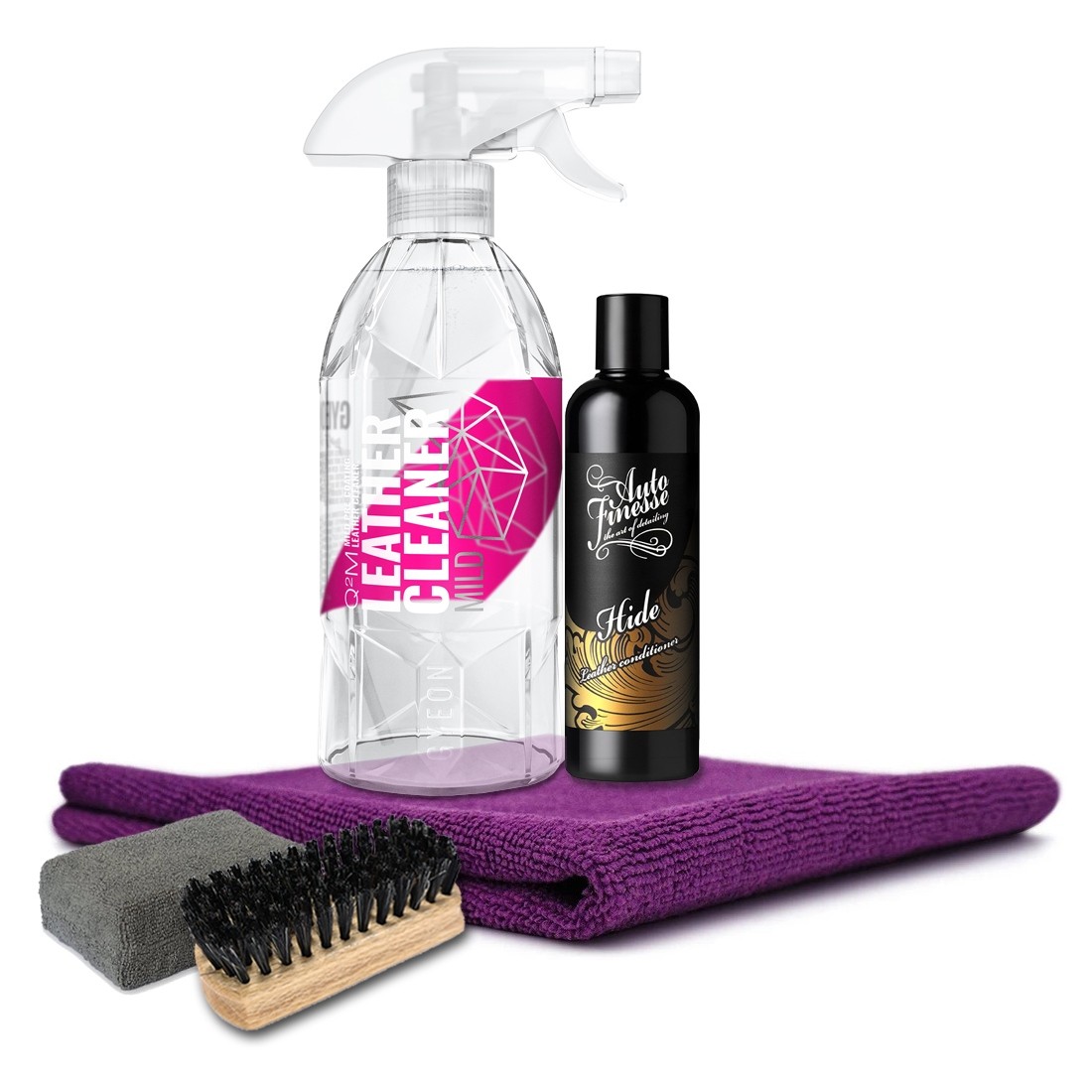 A complete set for cleaning and nourishing the leather in a car, which includes an effective but gentle leather cleaner Gyeon Q2M LeatherCleaner Mild 500 ml and a leather conditioner with a matte effect Auto Finesse Hide Leather Conditione 250 ml, including complete accessories.Gyeon LeatherCleaner Mild is the final preparation for leather before applying any protection. Removes light dirt, greasy residue and even discoloration from clothes. Unlike most leather cleaners, this product does not contain any emollients or preservatives, so the surface is ready for the application of any sealant or ceramic protection.