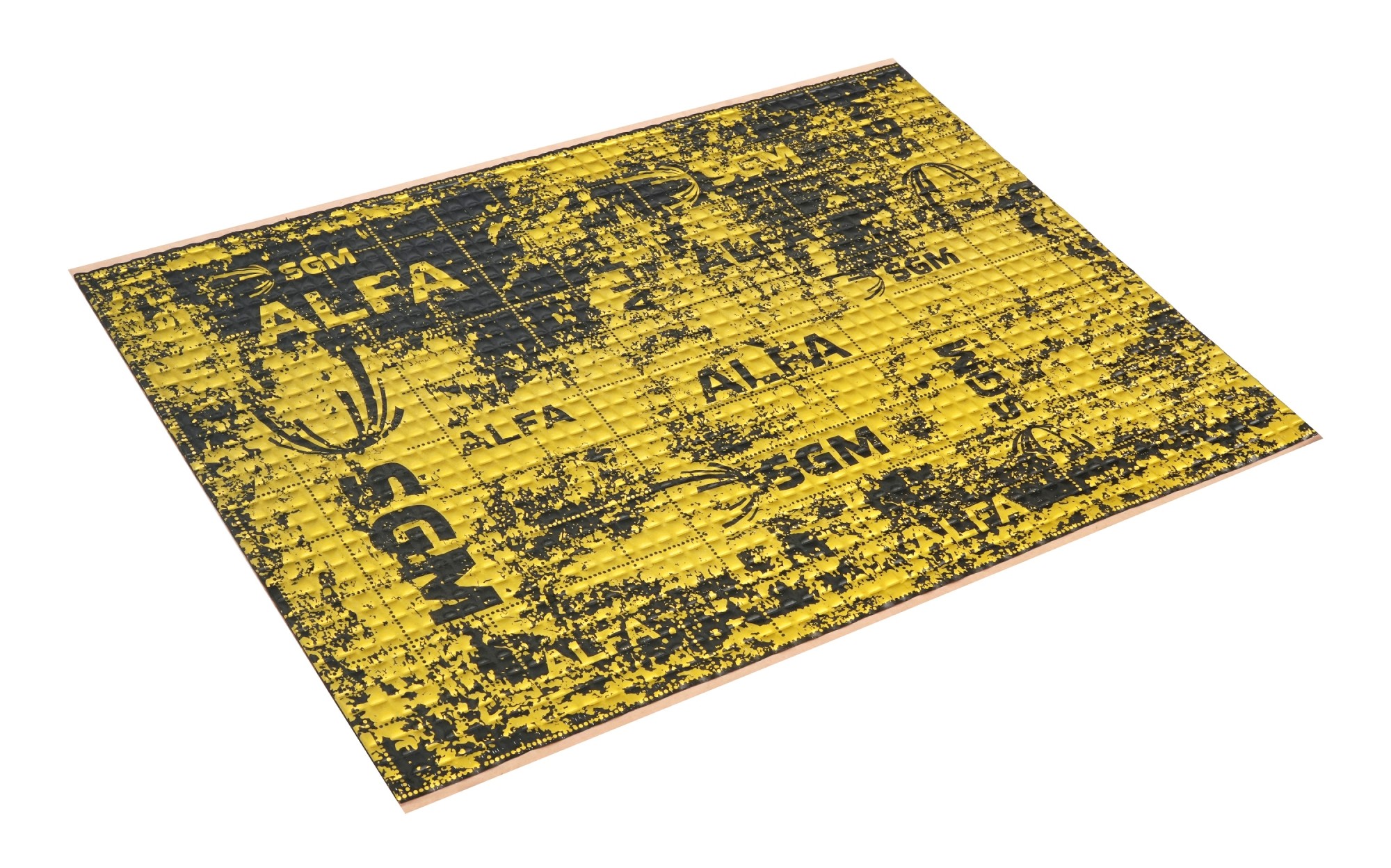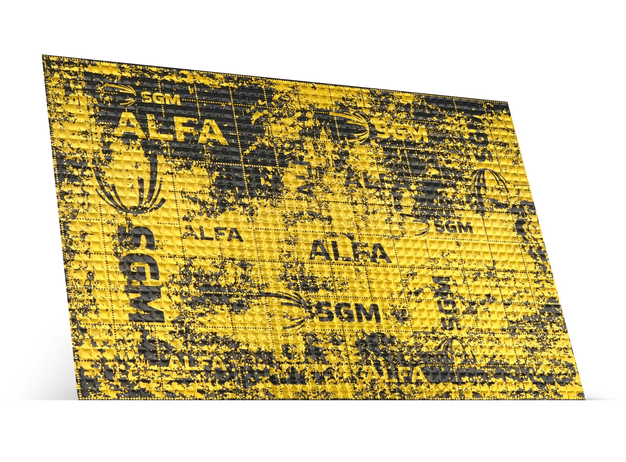 SGM Alpha 3 is an advanced anti-vibration material designed for effective suppression of body vibrations and resonances. It is manufactured on the basis of a next-generation self-adhesive polymer butyl rubber and a 90-micron aluminum foil. The foil, with a square embossing and black-and-gold coating, features a modern print; on the installation side the material is protected by a silicone-coated release film. A high acoustic loss factor MLF = 0.40 together with a 3 mm thickness provides excellent properties for zones with higher vibrational loads, such as the floor, trunk or firewall. Thanks to an optimized butyl rubber composition with improved adhesion and thermal stability, SGM Alpha 3 remains reliable across a temperature range from −40 °C to +100 °C. The material guarantees high efficiency in areas where the balance between weight and effective vibration damping is critical.