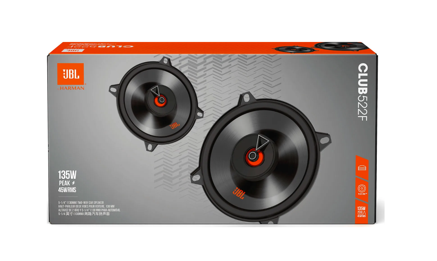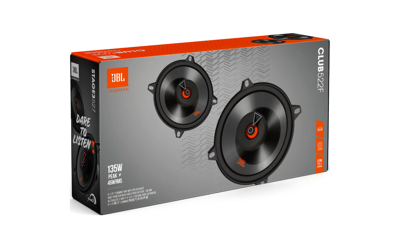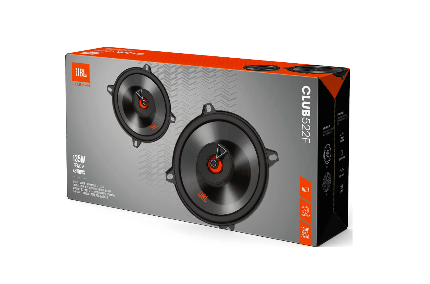 The JBL Club 522F speakers represent an affordable and effective upgrade to factory audio that delivers clearer, more dynamic and more detailed sound. These 5.25" (130 mm) two-way coaxial speakers are designed to fit into most vehicles while offering significantly better performance even when powered by a standard head unit. Their high sensitivity provides louder and more lively playback without the need for an external amplifier.