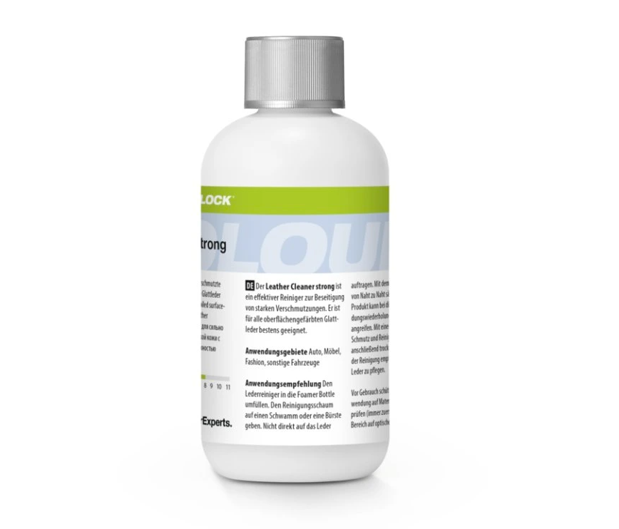 strong leather cleaner for surface-dyed smooth leather, which effectively removes stubborn dirt, grease, impregnation residues and light discolorations, 250 ml