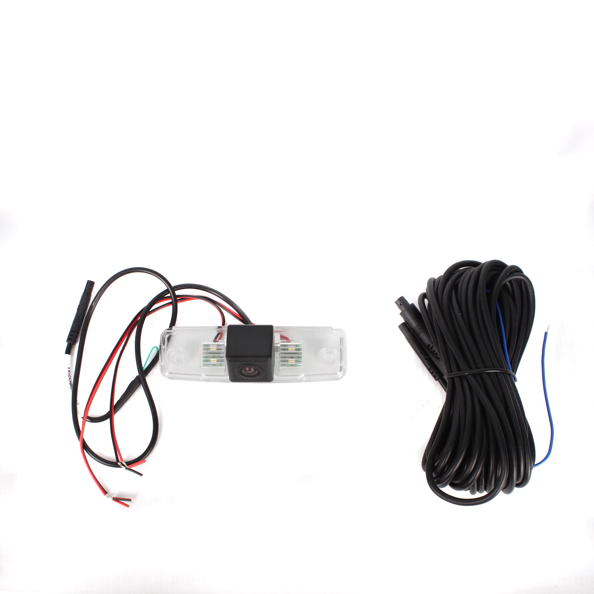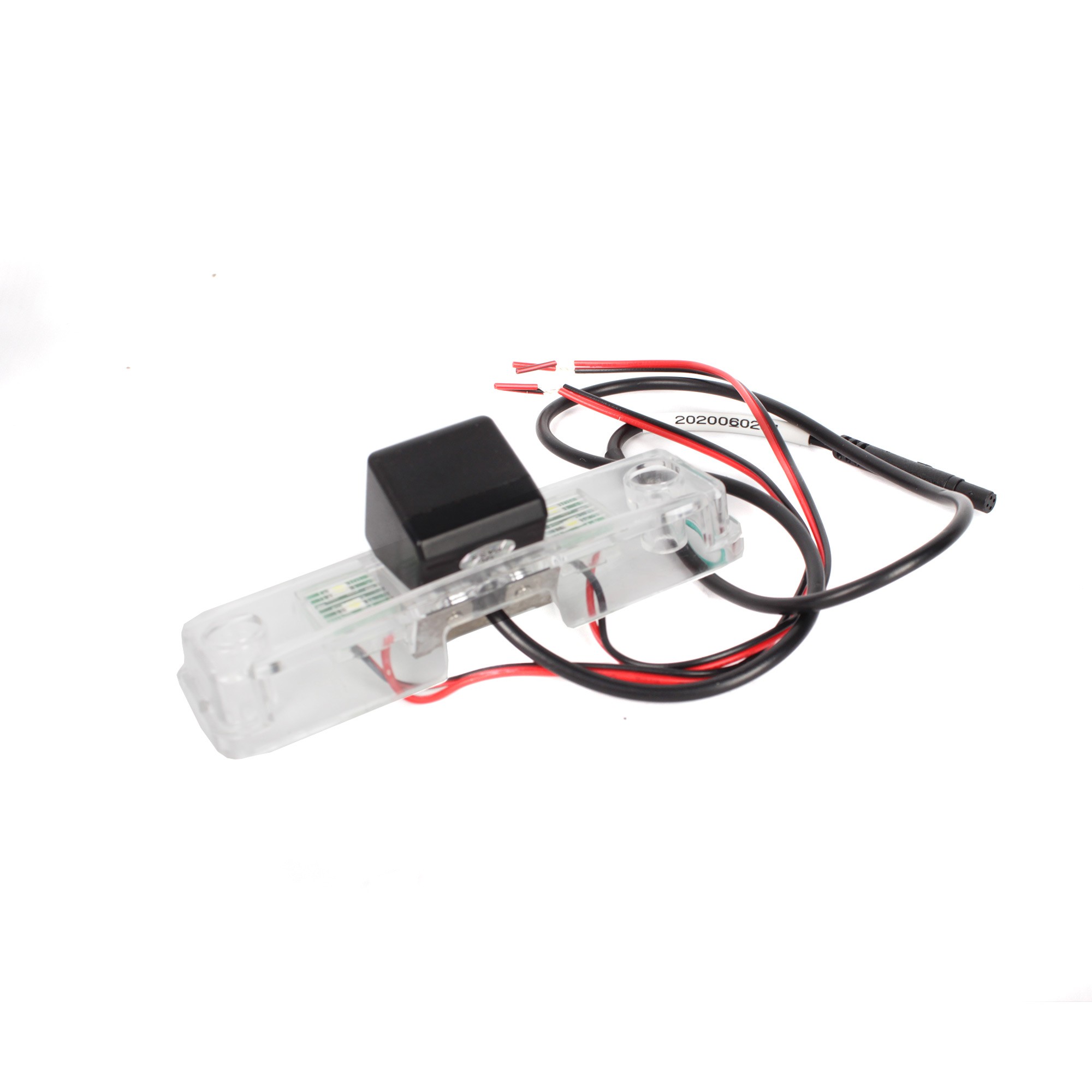 OEM color parking camera for installation in the rear license plate light. The camera includes an LED light that replaces the original lighting.