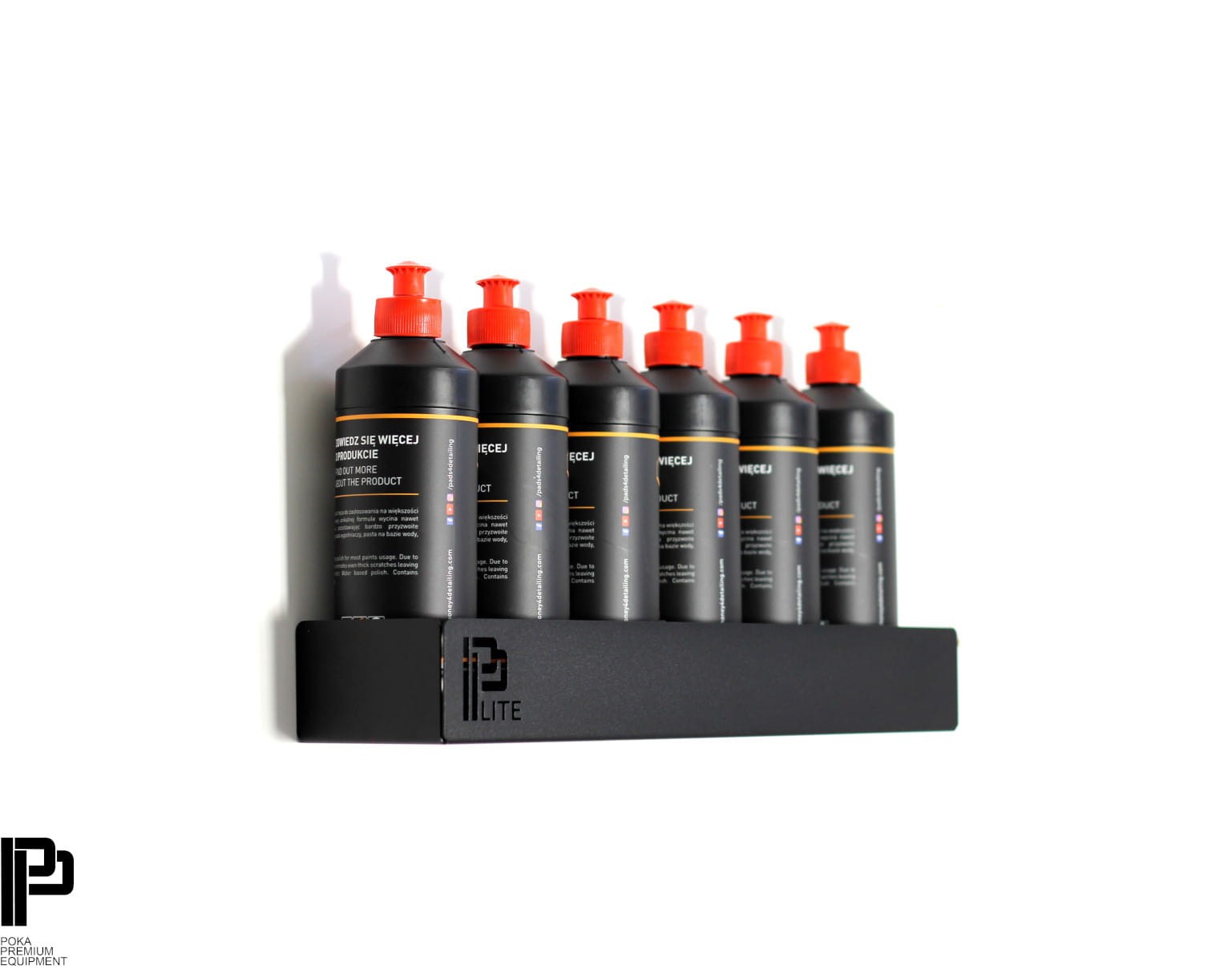 Poka Premium LITE is a product line that brings top craftsmanship, modern design and long service life at a more attractive price. It uses the same structural steel and durable powder coating as the premium POKA models, but without the galvanized layer – offering an ideal price-performance ratio. This metal holder/shelf for storing polishing compounds is an ideal solution for any detailing studio, workshop or garage, helping to keep the workspace organized and all products within reach. The shelf is made from 1 mm thick steel sheet, powder coated on both sides with a highly durable fine-textured powder finish that protects the surface against scratches, fading and corrosion. Thanks to precise CNC processing there are no sharp edges and it is completely safe for everyday use. The construction is designed to handle loads up to 5 kg and is compatible with most polishing compounds in sizes from 250 ml to 1 l available on the market.