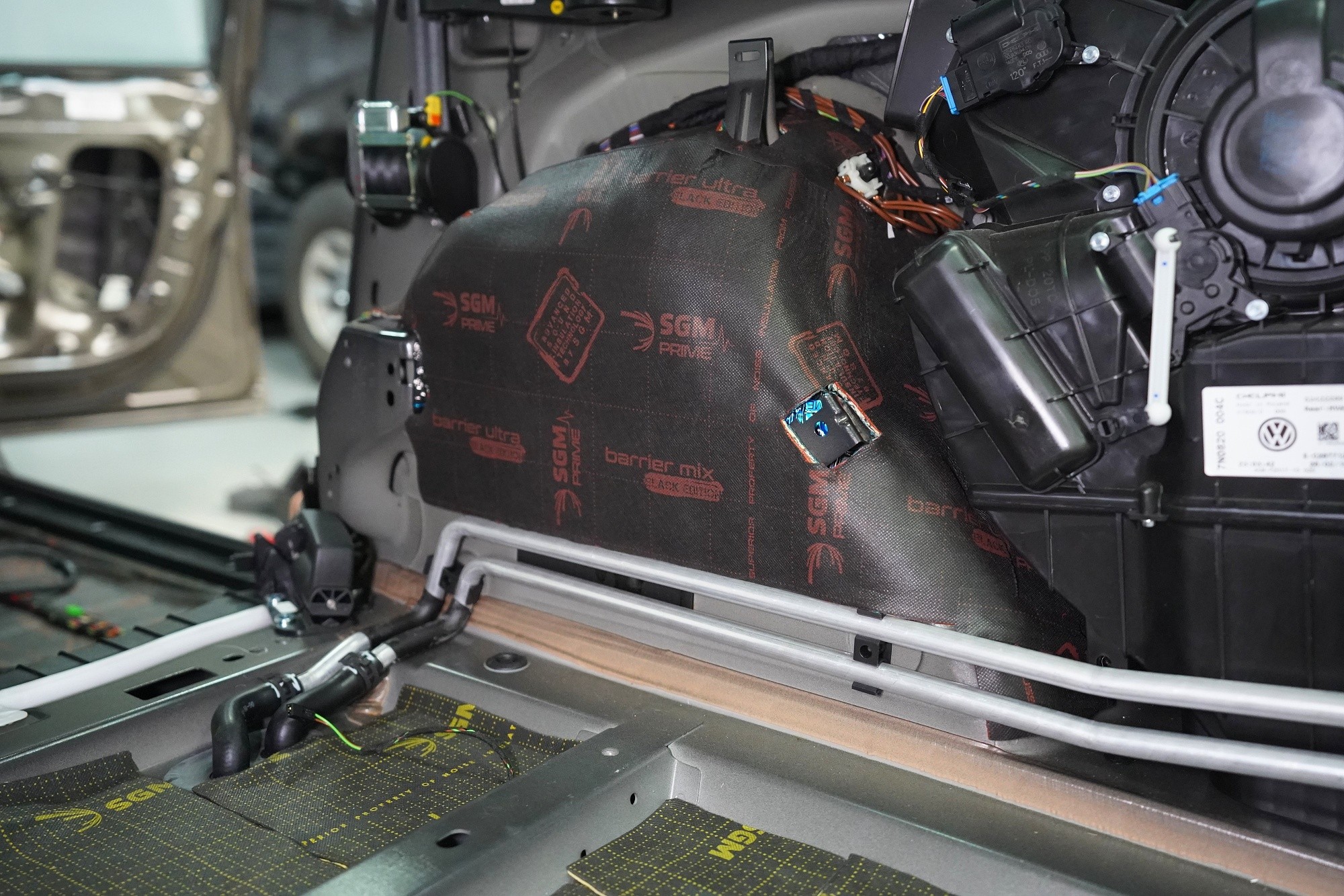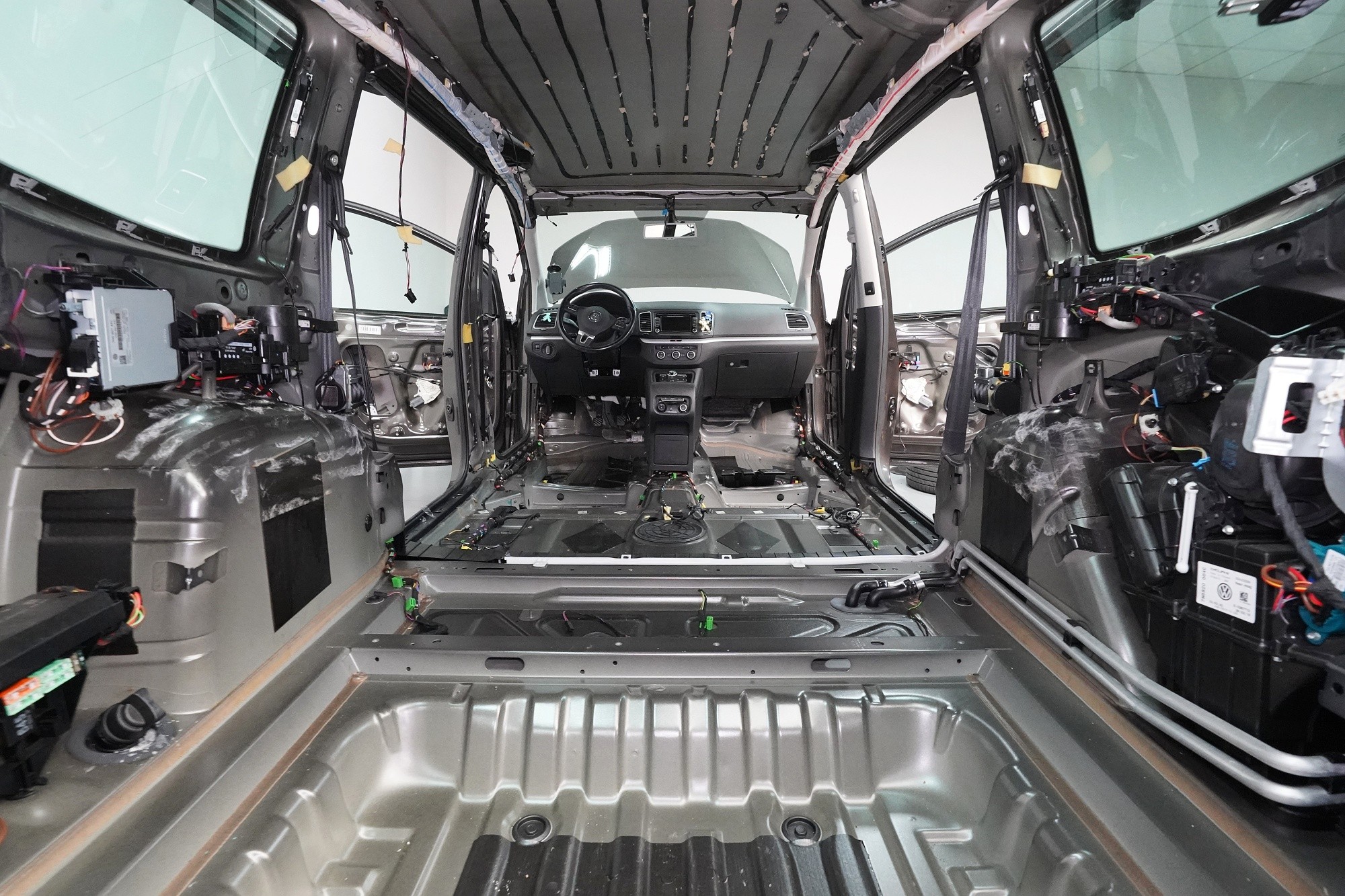 Complete soundproofing of the VW Sharan. This car is among the ideal family MPVs thanks to its spaciousness and practicality. However, for pleasant travel with the family, quality sound insulation is missing, as is the case with most cars of this type. As the speed rises, the noise of the tires, as well as the engine and the ubiquitous road and aerodynamic noise, make themselves known. That is also why the owner asked us to fix it and carry out additional noise reduction. We agreed with the owner on the best that we can currently offer, i.e. the Expert Plus package. So we soundproofed all essential areas of the car, namely the front, rear and fifth doors, floor, roof, luggage compartment, torpedo, bonnet and front and rear wheel arches from the inside. Such a demanding installation also requires sufficient time, and we spent a total of 36 hours on the car. Nevertheless, we soundproofed the car within one working day thanks to the presence of 4 of our technicians. For soundproofing, we chose premium anti-vibration and sound-insulating materials from the Russian manufacturer SGM, which offers modern and highly effective materials without the need to apply three layers of soundproofing. And we will use that in this challenging installation.