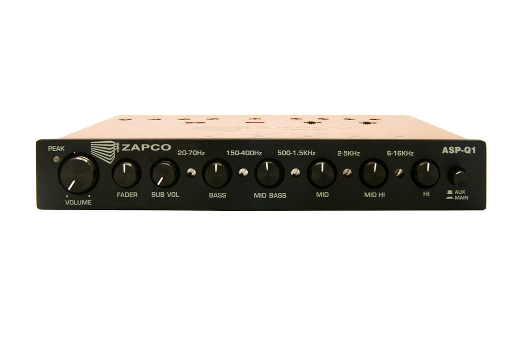An equalizer (preamp) that lives up to the Zapco name. Designed for everyone who is serious about sound quality. The ASP-Q1 was not designed to be an "accessory" toy or dashboard jewel. The ASP-Q1 was designed to be an effective tool in tuning and controlling the sound of the car audio system. As a dashboard mount equalizer, it's second to none. With 5 bands of parametric equalization, you can set ±18dB correction at any point in the frequency spectrum without being limited by fixed center points. With internal audiophile-grade components in the signal path and precise controls for all settings, the sound will be clean and transparent, with solid bass and crystal-clear highs. The ASP-Q1 also excels as a crossover. You can configure it as a 2-band crossover with bass and dual treble or as a 3-band crossover with bandpass. An aux input with its own input gain control allows you to connect a portable source and adjust the level of the main input. An oversized power supply gives you a 9.5V line driver with 14V available for peaks. This gives the ASP-Q1 plenty of headroom so that even with the biggest signal peaks you get a clean signal without distortion. The ASP-Q1 is more than just an equalizer. It's a true control preamplifier for your sound system.